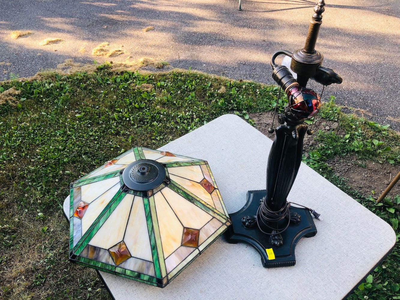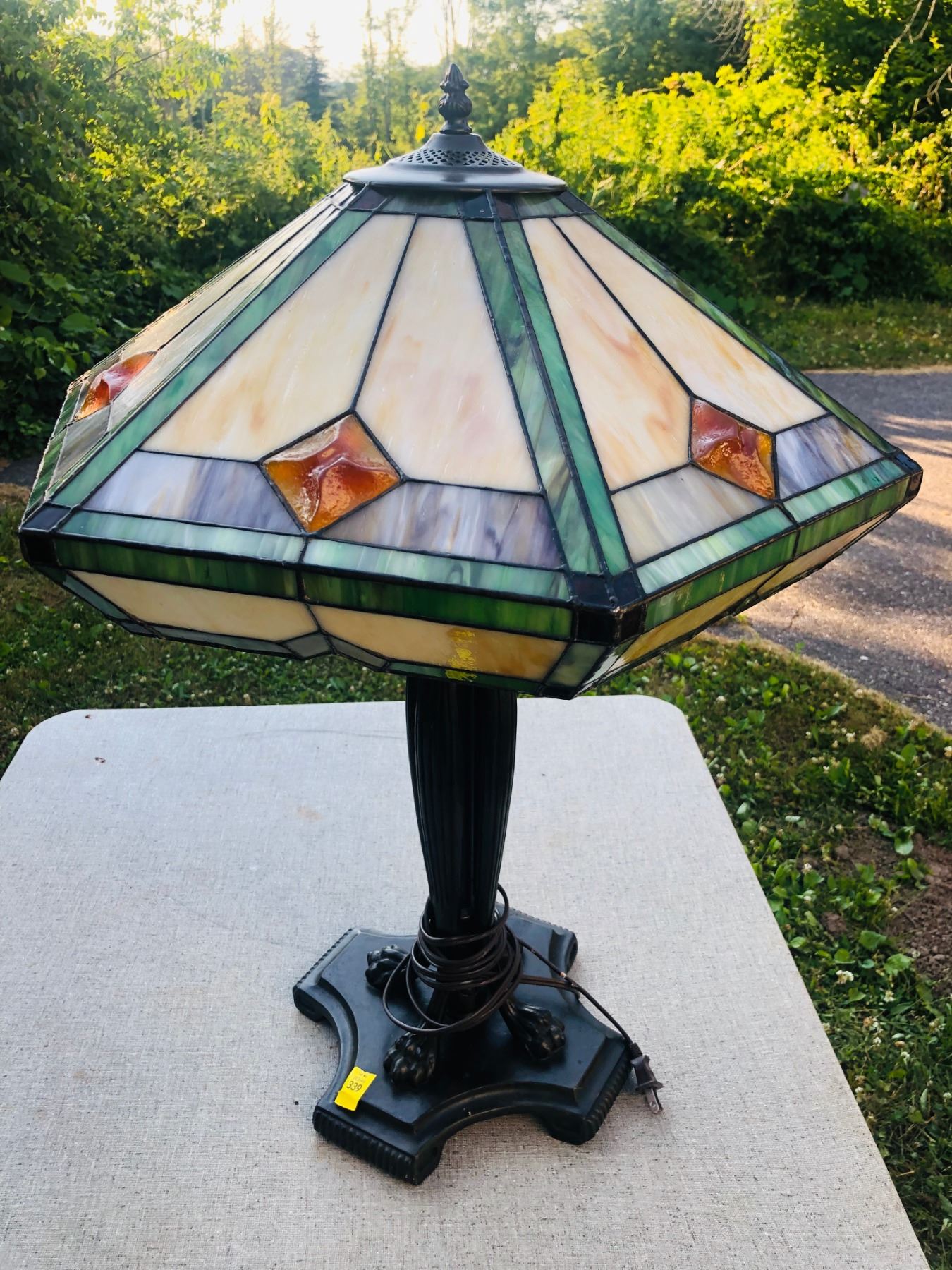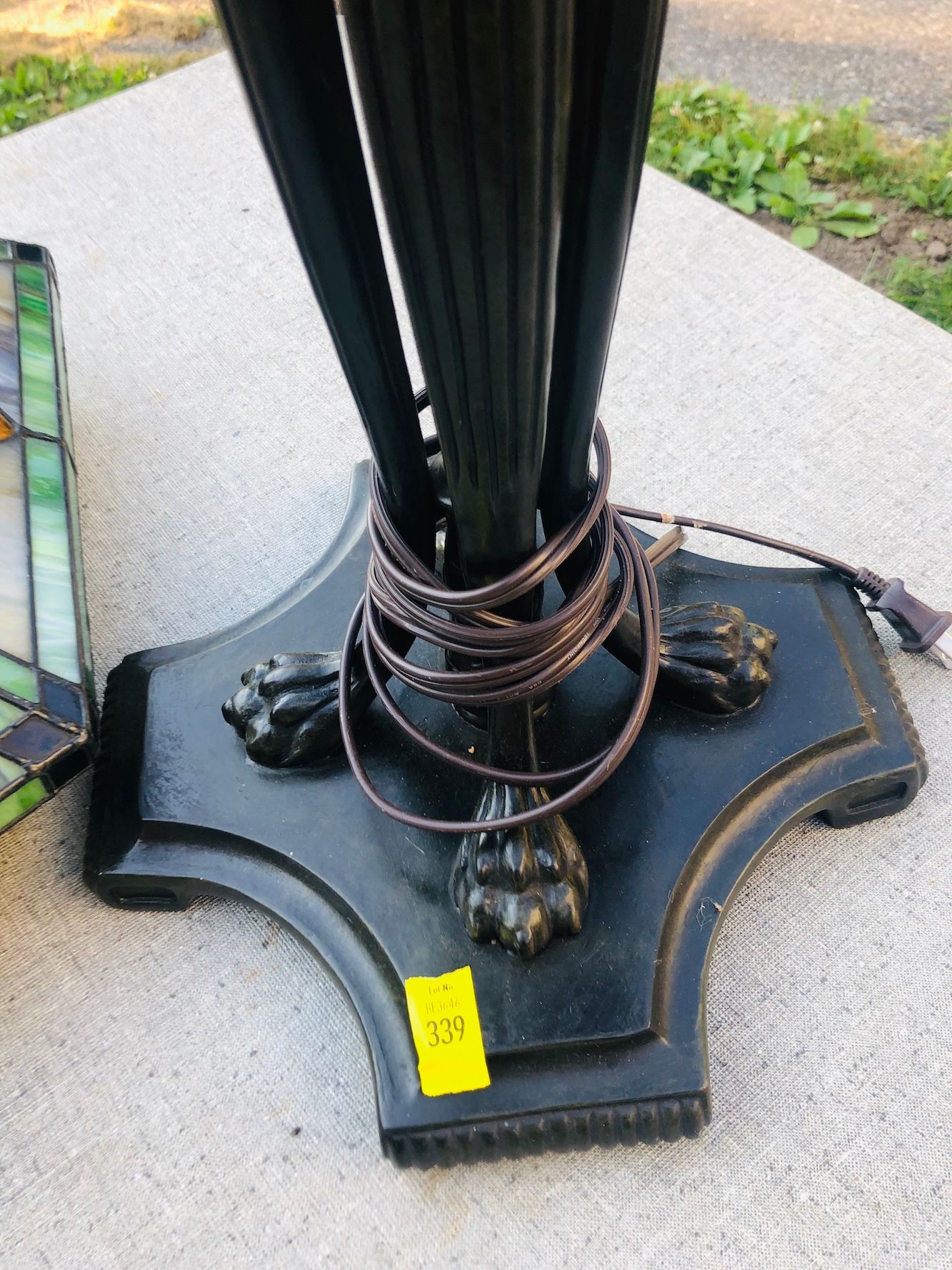 Leaded Glass table lamp, Arts and Crafts style leaded stained glass shade, nice lamp with claw feet on pedestal.