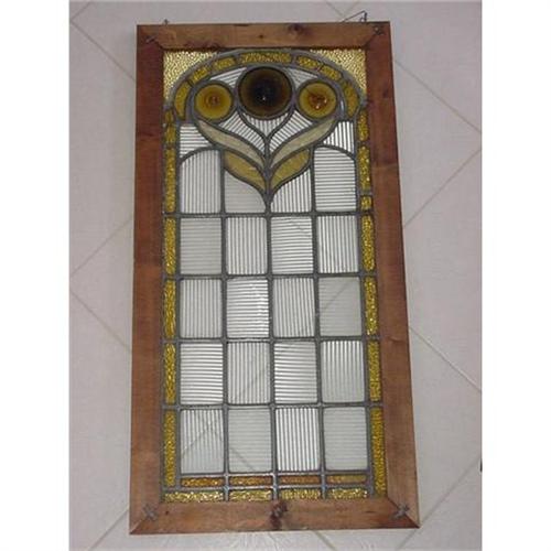 A leaded glass widow, 41" X 19 1/4", the frame makes the overall size 45 1/2" X 23 1/4". Neutral shades frame clear rectangles of ribbed glass. The condition is very good, all the pieces are intact. The newer frames are made to hang in an existing window. (17)