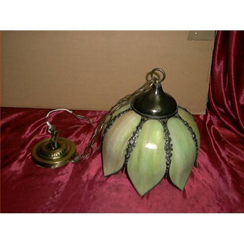 Leaded Panel Glass Hall Light. This is a real nice one, and colored greenish color, and works great. No cracks or chips in glass panels, and in really nice condition. Came out of an estate were they had it in the hallway entrance, and it looked really nice there. Just to give you some idea's on were to place it. It will look great really anywhere, but that is where we took it down from. It works great, just hook it up to electric, and go, it is 11" H and 11.5" W or Diam. very nice eye catching colors, and I hope you like it to. Enjoy.