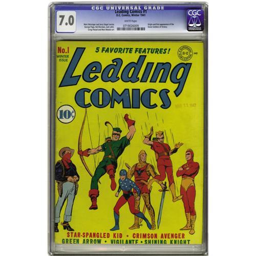 <B>Leading Comics #1 (DC, 1941) CGC FN/VF 7.0 White pages.</B></I> The Seven Soldiers of Victory -- Green Arrow, Speedy, Crimson Avenger, Vigilante, Silent Knight, and the Star-Spangled Kid and Stripesy -- debuted in this issue of the all-star DC series, designed to highlight its second-tier stars. Often undervalued by Overstreet, it is one of the cheapest DC Golden Age keys. Overstreet 2006 FN 6.0 value = $1,401; VF 8.0 value = $3,269. CGC census 3/06: 1 in 7.0, 6 higher.