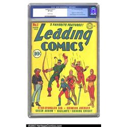 Leading Comics #1 (DC, 1941) CGC VF 8.0 Off-white pages. Following the lead of its other superhero anthology titles, All Star Comics and Star-Spangled Comics, DC launched this title in late 1941, which featured some of its tried and true Golden Age artists, such as Mort Meskin (who may be responsible for this first cover), Creig Flessel, Hal Sherman, and George Papp. This high-grade copy from sixty years ago ranks fourth in CGC's census for this issue. Overstreet 2002 VF 8.0 value = $2,750. Important notice: We expect to be auctioning lots at the rate of 200-250 per hour. Sometimes eBay Premier live bid software cannot keep up with that pace, so we strongly recommend that you place a realistic proxy bid now as insurance to avoid disappointment. Also please note that all Heritage/CAA lots purchased through eBay Premier carry a 20% Buyer's Premium. Please make sure you read the Terms and Conditions.