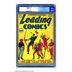 Leading Comics #1 Rockford pedigree (DC, 1941) CGC VF/NM 9.0 Cream to off-white pages. This high-grade premiere issue features the origin of the Seven Soldiers of Victory, and the beginning of the runs of many major characters, including Crimson Avenger, Green Arrow and Speedy, Shining Knight, the Vigilante, Star Spangled Kid and Stripesy. One of Vigilante's major villains, the Dummy, makes his first appearance as well. Overstreet 2002 NM 9.4 value = $5,500. Important notice: We expect to be auctioning lots at the rate of 200-250 per hour. Sometimes eBay Premier live bid software cannot keep up with that pace, so we strongly recommend that you place a realistic proxy bid now as insurance to avoid disappointment. Also please note that all Heritage/CAA lots purchased through eBay Premier carry a 20% Buyer's Premium. Please make sure you read the Terms and Conditions.