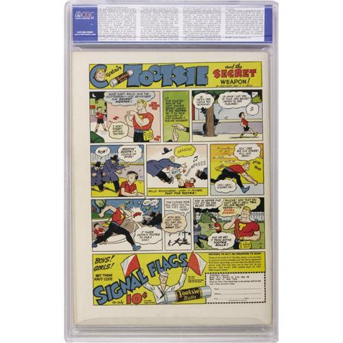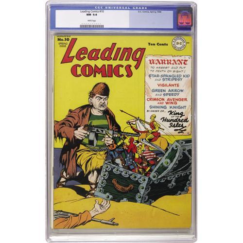 <B>Leading Comics #10 (DC, 1944) CGC NM 9.4 White pages.</B></I> Modern-day pirates, armed with machine guns instead of swords, menace the Seven Soldiers of Victory in this issue. This copy is quite a prize in itself, with a cover loaded with bright color, and interior pages that are supple and white. Overstreet 2006 NM- 9.2 value = $1,075. CGC census 10/06: 1 in 9.4, none higher.<BR><BR><b>Shipping:</b> Slabbed Comic (<a target="_blank" href="http://www.heritageauctions.com/common/shipping.php">view shipping information</a>)