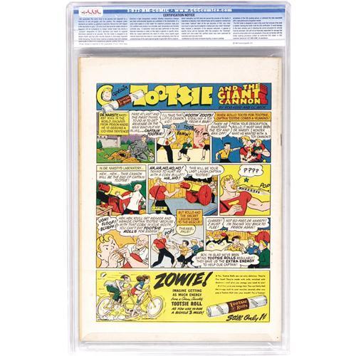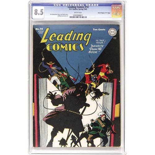 <B>Leading Comics #14 Davis Crippen ("D" Copy) pedigree (DC, 1945) CGC VF+ 8.5 White pages.</B></I> This book is graced by a unique cover by Jon Smalle, featuring a horde of evil-doers charging out of a giant book as the Seven Soldiers of Victory try to stop them. An oft-overlooked super-team, they've recently been revived by DC, leading to a resurgence in interest. Overstreet 2006 VF 8.0 value = $340; VF/NM 9.0 value = $533. CGC census 7/06: 1 in 8.5, 2 higher. <I>From the Crippen Collection.</B></I> <BR><BR><B>Important notice:</B> Heritage usually auctions material at the rate of 200-250 lots per hour. On some occasions eBay Live bid software or the Internet may not be able to keep up with the pace of the auction. We recommend placing a realistic absentee bid now as insurance to avoid disappointment. Occasionally the auctioneer may eliminate or reject an eBay Live bid, and the auctioneer may also reopen a lot after the close of the eBay live bidding (usually because we missed an audience bid), and may reject your bid even if it shows you as the winning bidder. By bidding via eBay Live, you agree that Heritage may award the lot to another bidder at its sole discretion under the circumstances described above or any other reasonable circumstances. Since eBay bids are not shown to us until we open the lot on the floor, we treat those bids just like floor bids. In most cases the floor responds before the eBay bid is presented to us, due to Internet lag time, so for consistency we have made it a policy that floor bids are always considered first over tie eBay live bids. Also please note that all Heritage lots purchased through eBay Live carry a 22.5% Buyer's Premium. Please make sure you read the Terms and Conditions before you bid. This lot is being auctioned in conjunction with a live floor auction by Heritage Auction Galleries. All final auction and invoice information will be supplied by Heritage Auction Galleries, and all other information should be considered preliminary. Lot:41001 <BR><BR><B>Winning Notification and Billing:</B> After the FINAL session in this auction is complete, Heritage will send e-mail and snail mail invoices. This process normally takes several days. All final auction and invoice information will be supplied by Heritage Auction Galleries, and all other information should be considered preliminary. <BR><BR>This auction will be conducted on a live auction floor and over the Internet through eBay Live. If you choose to place an absentee bid, please take a moment to <font color='#0000ff'><u><a href='http://pages.ebay.com/liveauctions/help/before/laabsentee.html'>learn how eBay Live absentee bidding works</a></u></font><font color='#000000'>