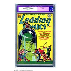 Leading Comics #4 Rockford pedigree (DC, 1942) CGC Apparent FN/VF 7.0 Slight (P) Off-white pages. The fourth issue of this anthology series has to have one of the most interesting covers of the entire run. It has such a historic feel and really places this book back into the early 1940s. This beautiful-looking Golden Age DC is deemed to be restored, but the only restoration is that the book has been cleaned and pressed. Overstreet 2002 FN 6.0 value = $273; VF 8.0 value = $568. Important notice: We expect to be auctioning lots at the rate of 200-250 per hour. Sometimes eBay Premier live bid software cannot keep up with that pace, so we strongly recommend that you place a realistic proxy bid now as insurance to avoid disappointment. Also please note that all Heritage/CAA lots purchased through eBay Premier carry a 20% Buyer's Premium. Please make sure you read the Terms and Conditions.