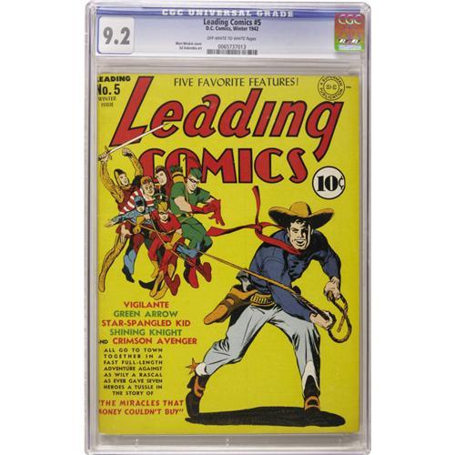 <B>Leading Comics #5 (DC, 1942) CGC NM- 9.2 Off-white to white pages.</B></I> The Vigilante rounds up the rest of the Seven Soldiers of Victory on this great Mort Meskin cover. Speaking of great, let's talk about the condition of this comic -- it's clean, flat, and sharp, with vibrant cover colors that seem to pop off the page. Set your sights on this one, partners, and toss out a bid! Overstreet 2006 NM- 9.2 value = $1,225. CGC census 10/06: 1 in 9.2, 2 higher.<BR><BR><b>Shipping:</b> Slabbed Comic (<a target="_blank" href="http://www.heritageauctions.com/common/shipping.php">view shipping information</a>)