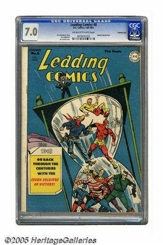 <B>Leading Comics #8 Crowley Copy pedigree (DC, 1943) CGC FN/VF 7.0 Off-white to white pages.</B></I> Jon Smalle cover with Joe Kubert art. Hard book to find in high grade - CGC has certified just two copies with better than VF 8.0 grades. Overstreet 2005 FN 6.0 value = $237; VF 8.0 value = $494. CGC census 5/05: 3 in 7.0, 5 higher.