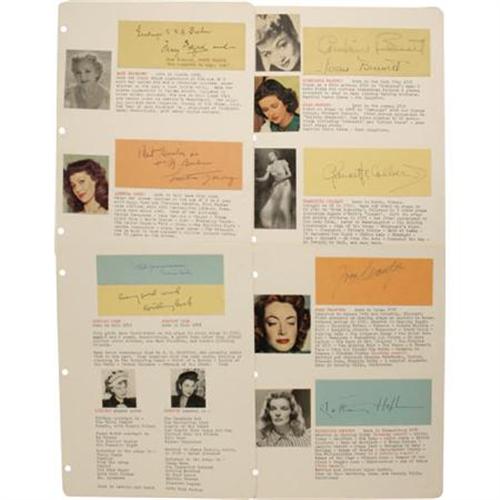 <B>Hollywood Leading Ladies Autograph Group.</B></I> This set of autograph cuttings includes signatures from Constance Bennett, Claudette Colbert, Joan Crawford, Katharine Hepburn, Lillian and Dorothy Gish, Mary Pickford, and Loretta Young, mounted on four heavy album pages with typed biographical notes and magazine photo clippings. Each is in Very Fine to Excellent condition with virtually no wear or discoloration.<BR><BR><b>Shipping:</b> Flat Material, Small (<a target="_blank" href="http://www.heritageauctions.com/common/shipping.php">view shipping information</a>)