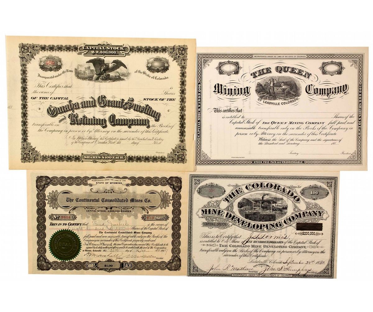 Lot of 4. 1) The Continental Consolidated Mines Co. Incorporated in Wyoming. Cert. #2024 issued in 1907 to Fred Jackal for 810 shares. U/C. Signed by Marshall, secretary and president [illegible]. 2) The Queen Mining Co. Incorporated in Colorado. Unnumbered, U/I, U/C cert. ca.1880s. Central vignette of two miners with pick axe and ore cart. 3) Omaha and Grand Smelting & Refining Co. Incorporated in Colorado. Cert. #469 U/I, U/C. The company was set up to process ore for Leadville mines. 4)The Colorado Mine Development Co. Incorporated in Colorado. Cert. #508 issued Sept. 29, 1880. U/C. Signed by John Mathews, secretary and John F. Humphreys, president. Placer gold was discovered in the Leadville area in 1860 but was overshadowed in 1877 by silver-bearing lead carbonate. Monthly totals for 1880, show Leadville ore shipments at over a million dollars/mo., mostly from lead and silver [Burchard, Production of Gold and Silver in the United States, 1880.