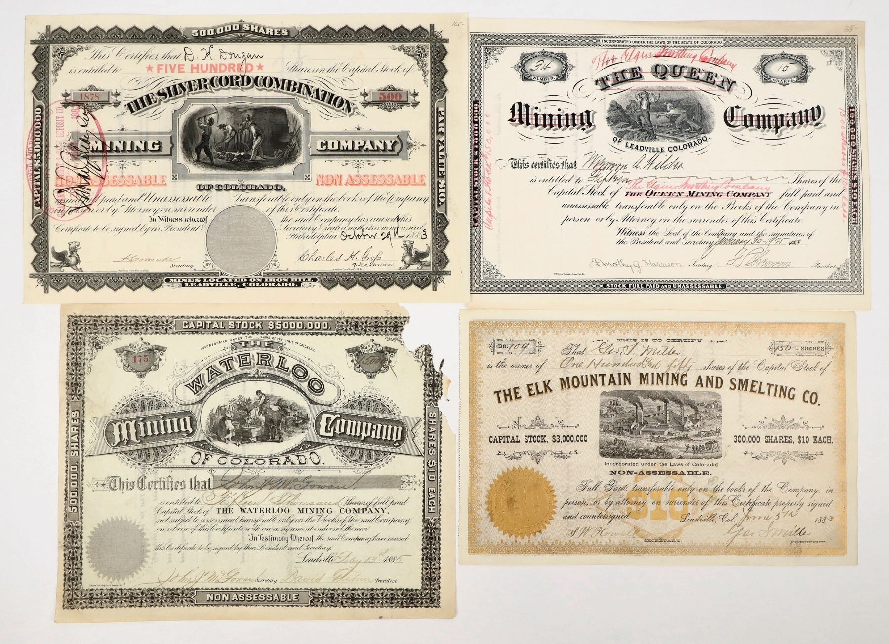 Lot of 4. I/U, I/C. VG or better. 1. The Waterloo Mining Co. of Colorado., issued 1885. Vignette of man/woman watering horse. Upper right corner torn. Empire Litho & Eng. printer. 2. The Queen Mining Co. of Leadville, Co. . issued 1925, vignette of miners. The Queen has been crossed out and handwritten in red id "The Elgin Smelting Company" F.H. Taylor printer. . 3. The Silver Cord Combination Mining Co. , issued 1883. Vignette miners in shaft. American BNC printer. 4. The Elk Mountain Mining and Smelting Co. issued 1883. Vignette of smelter. Gold embossed seal. "$10" gold underprint.