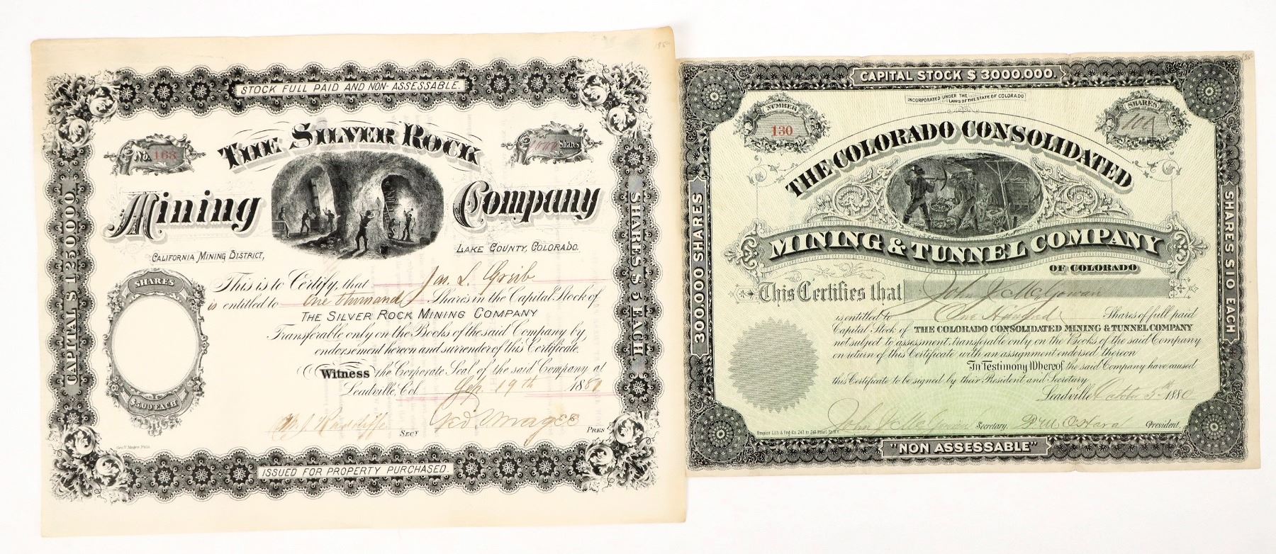 Lot of 2. I/U. VF. The Colorado Consolidated Mining & Tunnel Co. issued 1880, vignette miner in shaft. Empire Litho & Eng. printer. The Silver Rock Mining Co., issued 1881. Vignette miners working tunnels. Tri-fold. Geo V. Magee printer.