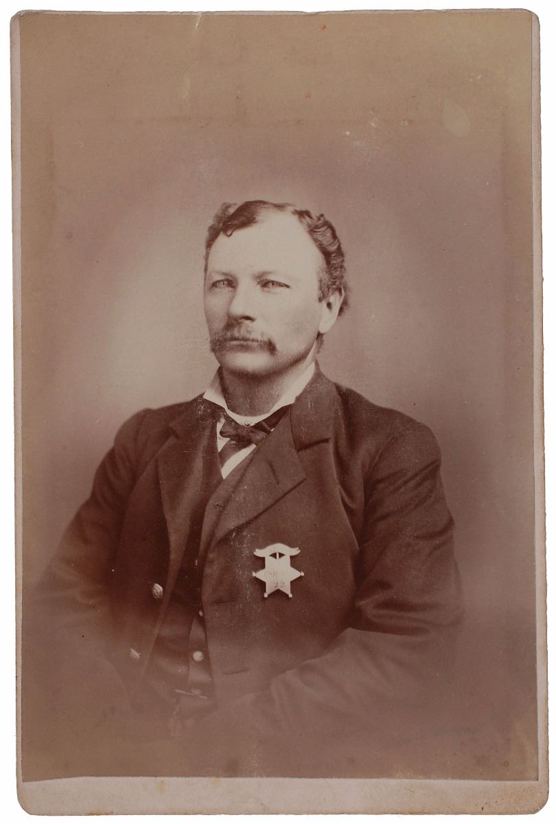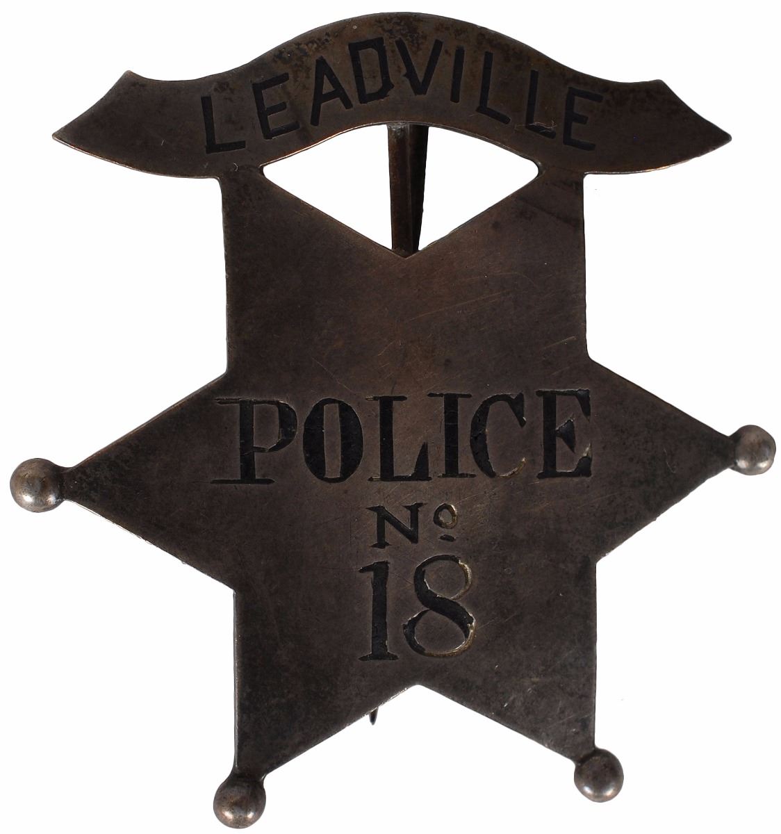 An exceptionally rare policeman's badge in the shape of a star, engraved “Leadville” across the top banner with “Police No. 18” in the center of the star. With this is a cabinet photo of a Leadville policeman wearing badge number 22, imprinted on the reverse by the studio, "Rocky Mountain Art Gallery, J. C. Macurdy, Portrait and Landscape Photographer, East 5th St., North of Quincy Block, Leadville, Colorado." Except for the policeman number, the badges appear to be exactly the same.
