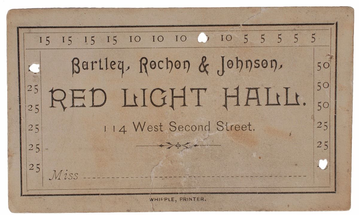 Like any Wild West boomtown, Leadville had its fair share of brothels, represented here by a prostitute’s punch card for employment at Leadville's “Bartley, Rochon & Johnson, Red Light Hall, 114 West Second Street.” West Second Street was designated as the official ‘red light’ district, with the Red Light Hall being one of its notorious dance halls and brothels.
