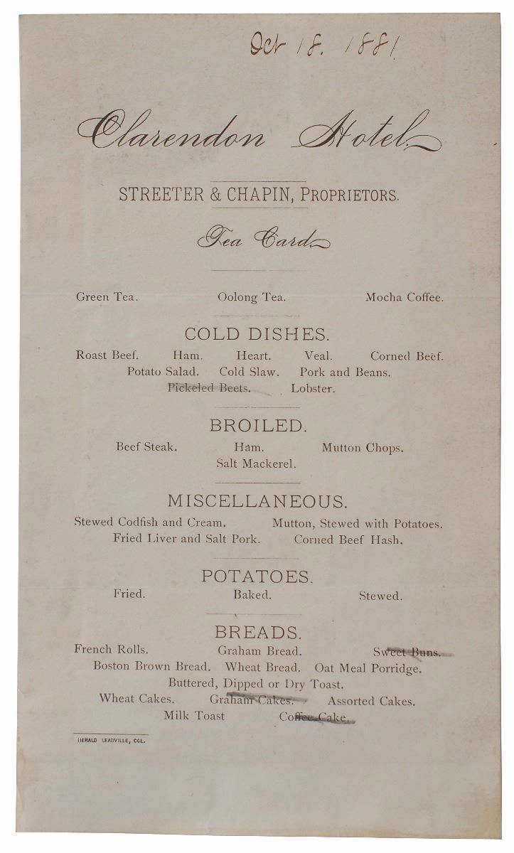 Among the items this collection are numerous original photographs and stereoviews showing the city’s progress as saloons, stores, and other businesses begin to line streets—telephone poles, too, as the communications revolution took hold. The area’s drastic increase in commerce is revealed in dozens of billheads, receipts, and other ephemera from Leadville businesses. Most interesting, of course, are the items related to Leadville’s lawlessness, which include an original Leadville policeman’s badge, a tintype of a policeman, tokens for several local establishments, a prostitute’s punch card, and saloon’s billiards license. Also of the utmost desirability are a presentation fire horn and a wedding announcement for Horace Tabor. Details of some of these highlights: