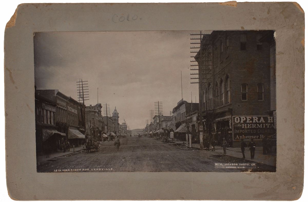 In the collection are six other tokens of various denominations for The Saratoga, Henry Martinez, Henry & Fred Office Buffet, Earl A. Johnson, Mack’s Bar and Cafe, and two for the Adolph & Zeiler Health Office. Subjects of stereoview photos include street scenes of Harrison Avenue and Chestnut Street, mines, and the town from a distance. Cabinet photos include portraits by Leadville studios Brisbois and J. F. Needles, the Leadville boardwalk with Barnum & Bailey advertisements in the background, the town from a distance, and several street scenes. Billheads trace the development of Leadville’s industry, with a blacksmith, grocer, telephone company, mining company, grocer, art supplier, bookstore, lumber dealer, and railway all represented. Also included is a large, impressive banner reading, “Pikes Peak Local No. 1662, Eight Hours, United Mine Workers of America, El Paso Co. Col.,” representing the area’s mining unions that held enormous power within the labor force. An enormous 1902 map of Leadville is included as well, along with assorted other items.