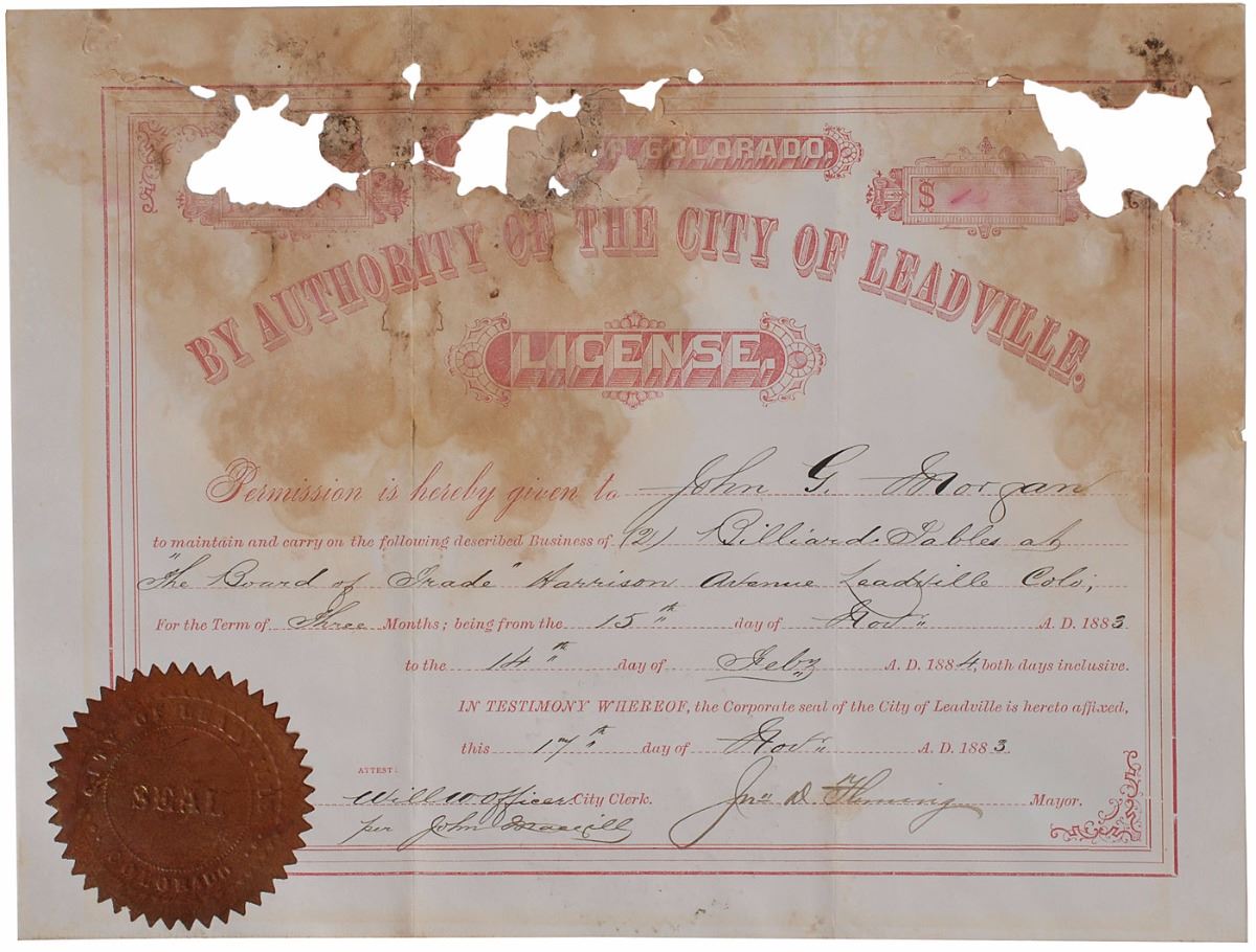Three fantastic items relate to the Board of Trade saloon, one of Doc Holliday’s favorite hangouts: first is an original twenty-cent trade token reading, “Board of Trade, 20, J. G. Morgan,” on both sides; second is a three-month license issued by the mayor of Leadville, November 17, 1883, granting permission to “John G. Morgan to maintain and carry on the following described Business of (2) Billiard Tables at ‘The Board of Trade,’ Harrison Avenue, Leadville, Colo.”; and a circa 1880s cabinet photo of Leadville's Harrison Avenue by important photographer W. H. Jackson, with the Board of Trade visible as the second building from the left, as well as the important locations of Tabor Opera House and Hyman's Club. Also visible in this image are a sign advertising keno outside of Hyman’s and an Anheuser-Busch sign outside the theater. In addition to the Board of Trade, Doc Holliday spent much of his time gambling at Hyman’s, which was where he shot bartender and ex-police officer Billy Allen.