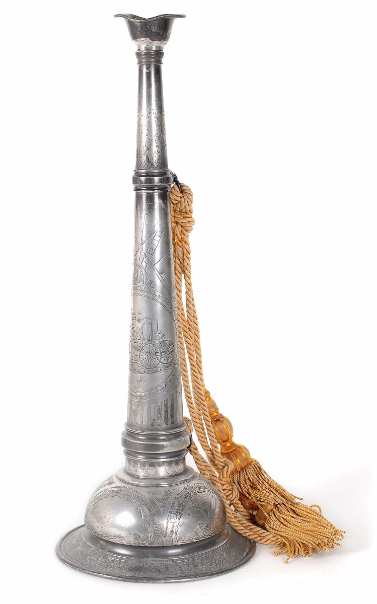 Also of great interest is a small pamphlet from the Hotel Windsor promoting Leadville to travelers and advising them to "wear clothes you do not care for as the dust during the stage ride will ruin any good piece of clothing." The Hotel Windsor would burn down on May 19, 1882, in the worst fire to ever strike Leadville—the result of arson, not an uncommon occurrence in the boomtown. Related to Leadville’s firemen are two of the most appealing items in this collection, a Leadville fire chief’s trumpet and a period tintype of a fireman. The gorgeous silver-plated ceremonial fireman’s trumpet measures 23.5? tall with a 9? diameter bell and is engraved on one side of the bell, “Awarded to the Humphrey Hose by the Fun on the Bristol Co., Leadville, Colo., Feb. 15th 1882,” and on the other, “Presented to Asst Chief L. A. Scholes by the H. H. Co. N. 2, May 24th 1882.” The horn features ornate designs on the sides and is engraved with depictions of a fire wagon, hoses, ladders, and firefighters’ helmets. It retains its original golden rope with tassels. “Fun on the Bristol” was a troupe in town to perform at the Tabor Opera House, and this trumpet was initially awarded to the Humphrey Hose firemen company for selling a large number of tickets for their engagements; the trumpet presentation is mentioned in the Leadville Daily Herald issue of February 16, 1882. The tintype is presented in its original 3.25 x 3.75 case and depicts a fireman in a three-quarter-length pose, holding a similar looking fireman’s trumpet against his hip.