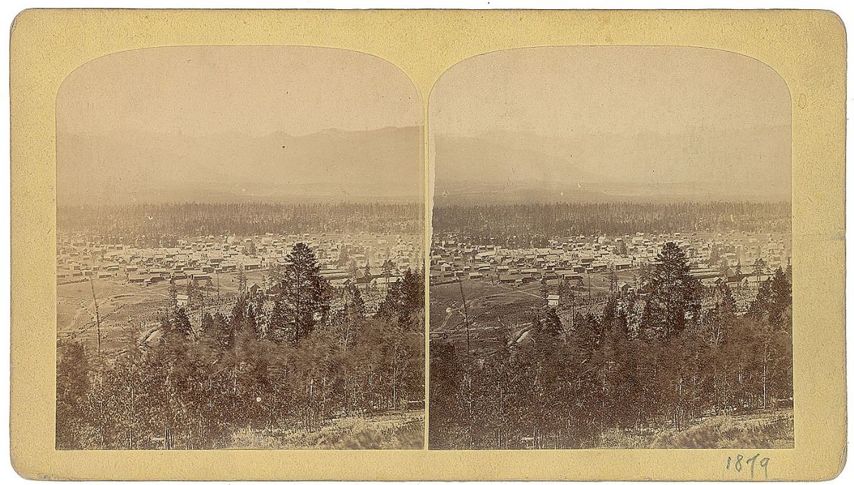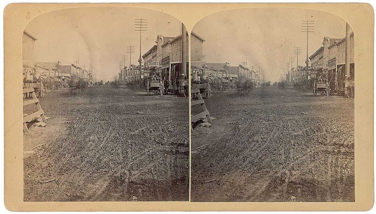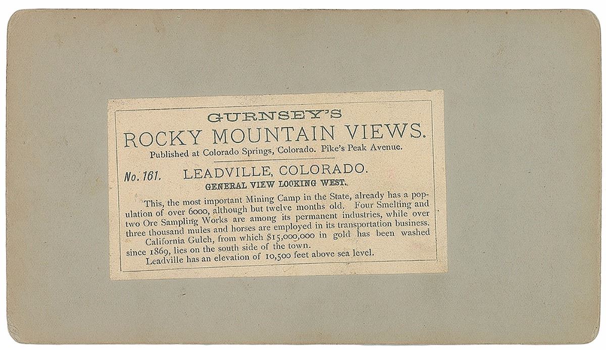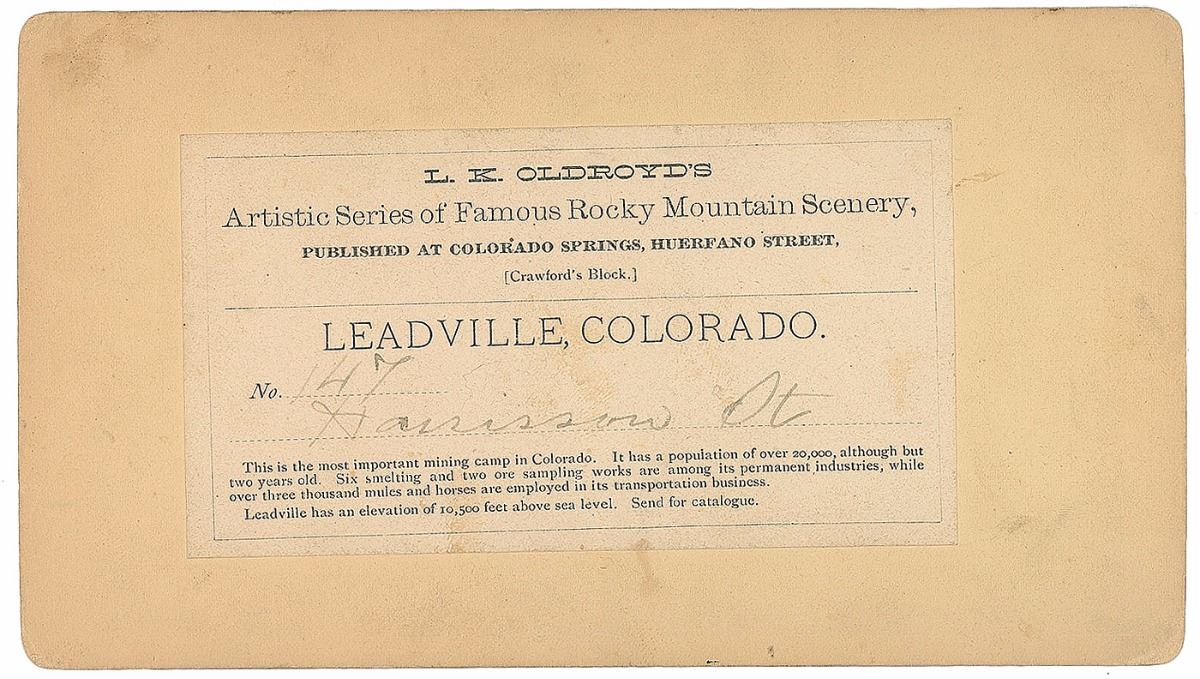 Wonderful pair of stereoview photos representing the rapid expansion of the mining town: first is one by Gurnsey showing Leadville looking west, with a caption on the reverse reading, in part: "This, the most important mining camp in the state, already has a population over 6000, although but twelve months old”; second is by L. K. Oldroyd of Colorado Springs entitled "Leadville, Colorado. No. 147, Harrisson St. [sic]," showing the dirt road with a few wagons lining the street as well as businesses and telephone poles, with the label on the reverse calling Leadville "the most important mining camp in Colorado" and noting a population of 20,000 "although but two years old." In overall fine condition.