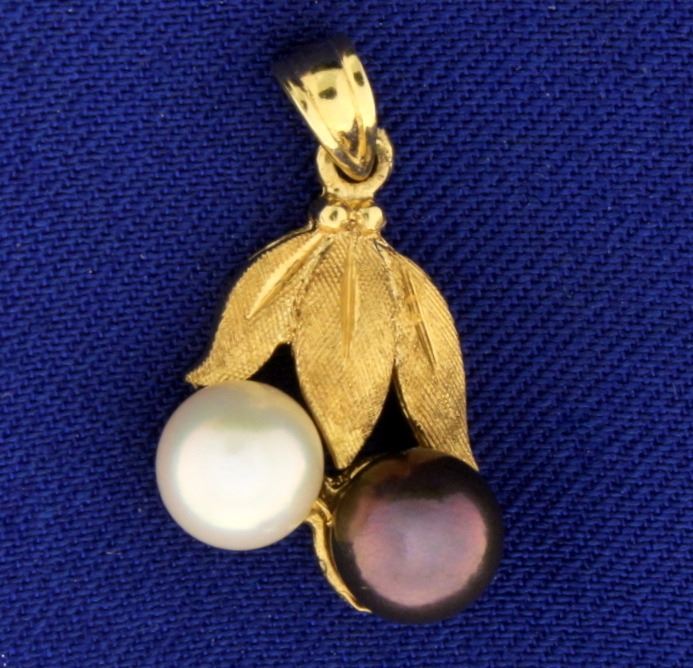 In 14k yellow gold. Contains a 6mm white pearl and a 7mm black pearl with excellent color and luster. 3/4" long with bale. 2.2g.