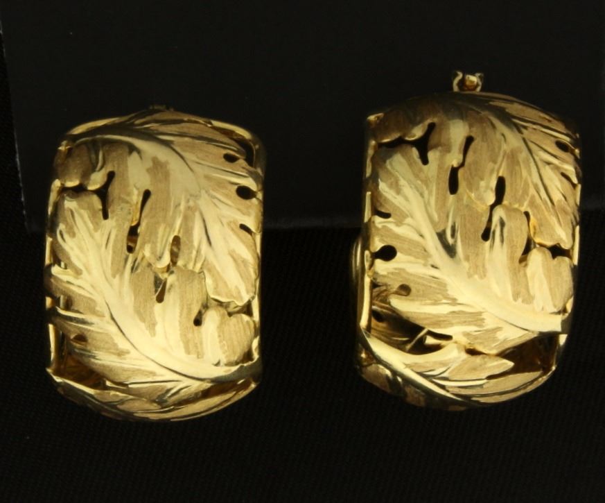 In 14k yellow gold. 3/4 inch diameter and 14mm wide with latch closing. 6.4g.