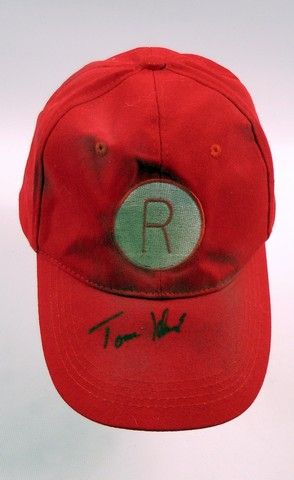 Many people didn't realize that one of the most beloved sports features ever produced, "A League of Their Own" (1992) was based on the real-life All-American Girls Professional Baseball League, which was started in the 1940's when Major League Baseball was virtually at a standstill since all able-body men were off to War. With a stellar cast including Tom Hanks, Geena Davis, Rosie O'Donnell, and Madonna, the film was a box office and critical sensation. And of course it gave us the iconic line: "There's no crying in baseball!", which has been repeated all over the world, and even in the halls of Congress. In fact so loved was this film that in 2012 it was selected for preservation in the US National Film Registry by the Library of Congress for its cultural, historical and aesthetic significance. This is a Cast & Crew cap, inspired by the red uniform caps worn by the Rockford Peaches, the all-girls baseball team that Hanks manages. It too has the trademark "R" on the front. And best of all, it is signed by Manager Jimmy Dugan himself: Tom Hanks.
