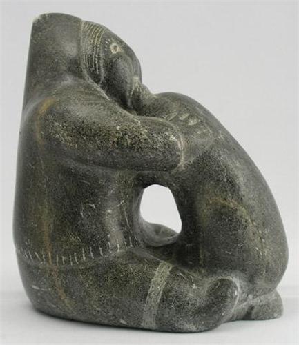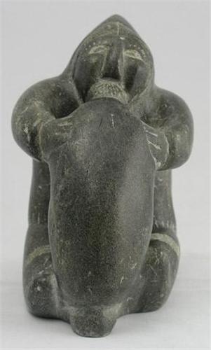 [Canadian, Payne Bay, 20th century] MAN BLOWING BLADDER; 1976 Grey stone carving 6 ¾ ins. high
