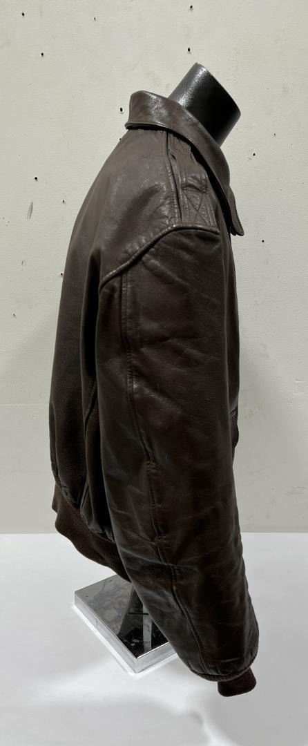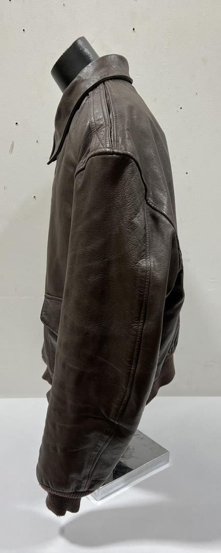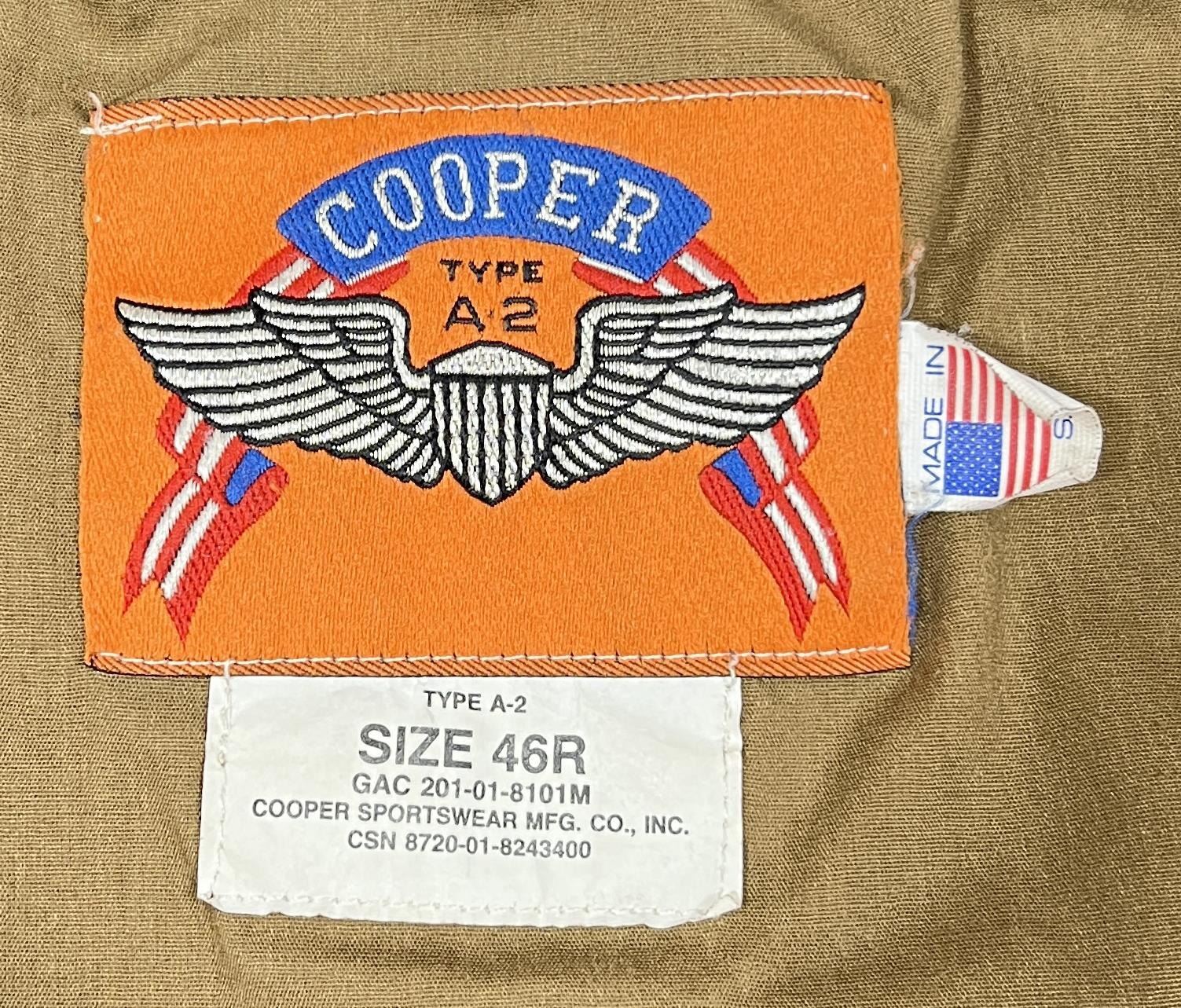 Nice leather Contemporary A2 Flight Jacket made by Cooper Sportswear Mfg. Co., Inc. The jacket is Size 46 Regular. The jacket was made in the USA. Has very light wear to the lining in the armpit area. Otherwise, jacket is sound.
