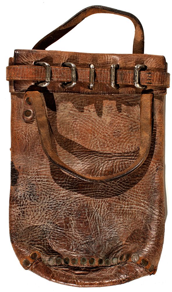 This is a high quality controlled security assay bag, similar to the one we had a year ago for a Comstock assayer. It is made of heavy duty leather, riveted not sewn. In this manner, either high grade (hence dense and heavy) ore samples or bullion samples could be taken to the assayer directly from the mine/assay/mill office without chance of spillage, and also done in secret. There is a leather strap and metal rings that allow for a firm seal, complete with locking apparatus. It has no markings to indicate any maker, assayer or mine. It measures 11”x 8” and has a brass hasp on the end of a leather strap for a padlock. The sealing leather strap or band has an indication that it was cut and repaired. This can only be caused by someone opening the pouch while the lock was in place. There are also two leather handles. There is a 2”x 4” patch repair that is also riveted. This is a very sturdy handsome piece that would enhance any mining or bank collection. These are so rare that this is only the second example we've seen. - HKA#64424