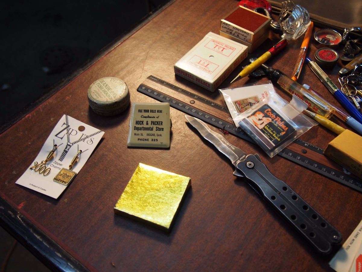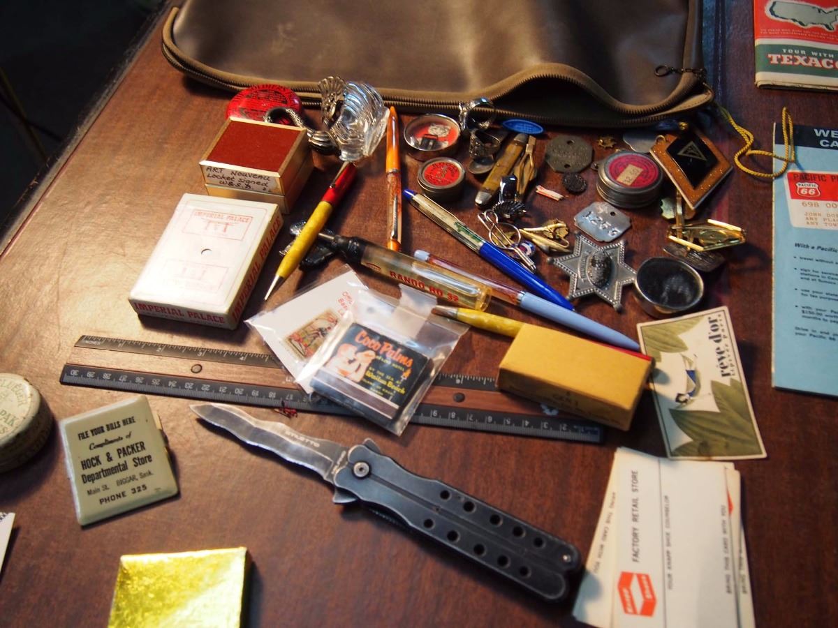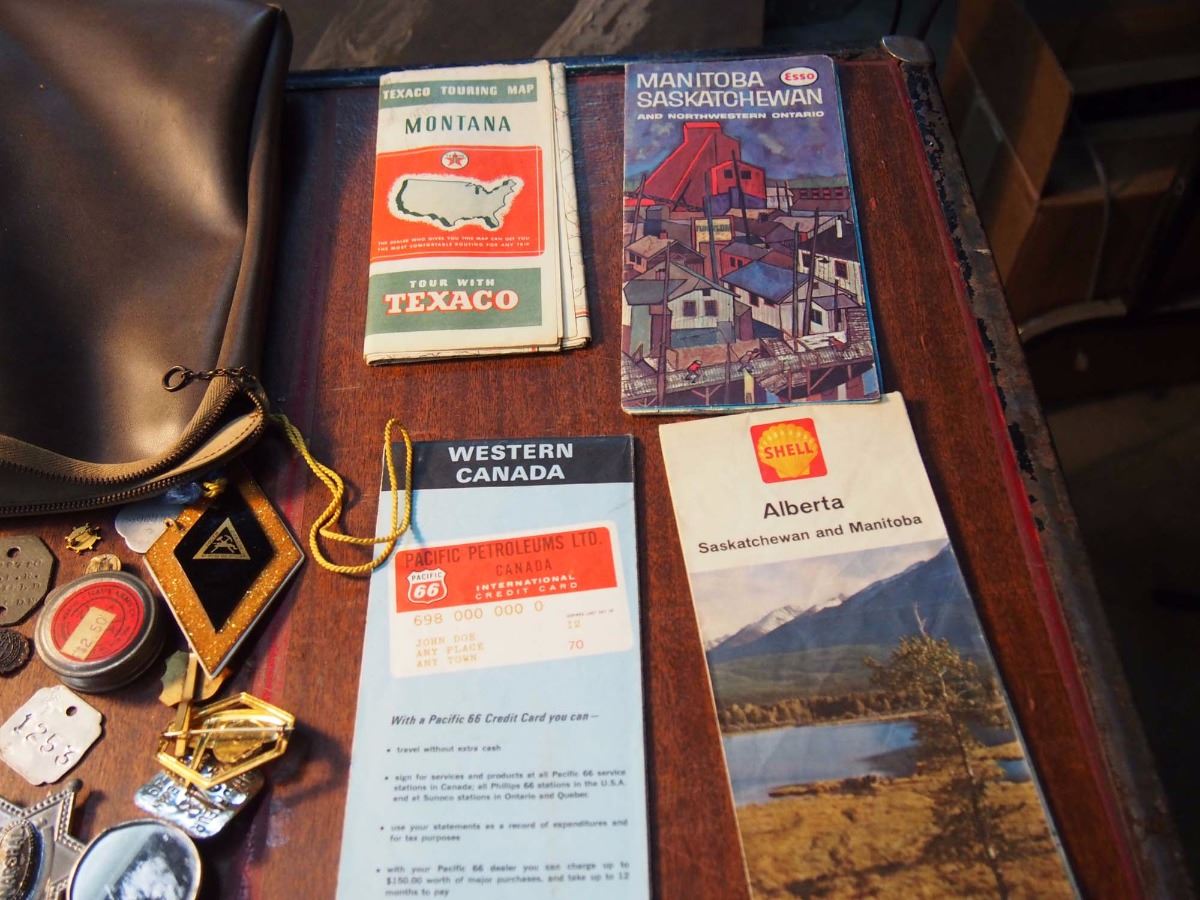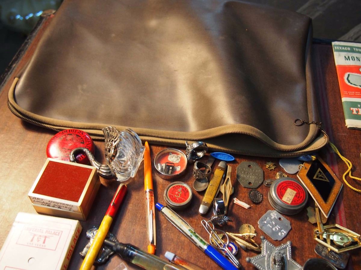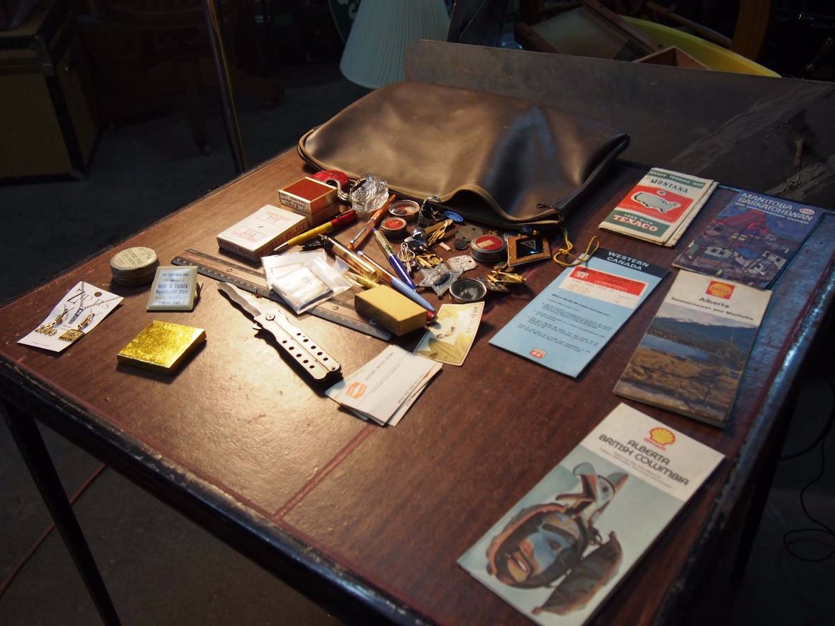 Leather Bag Full Of Misc, Old Maps, Pins, Pens, Rings, Texaco, Fish Hooks