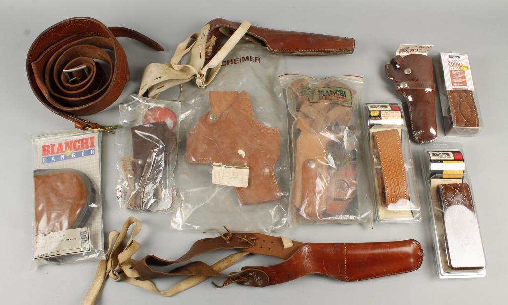 Including: several cartridge belts, 2 Bianchi shoulder rigs, several holsters that are like new, and leather slings.