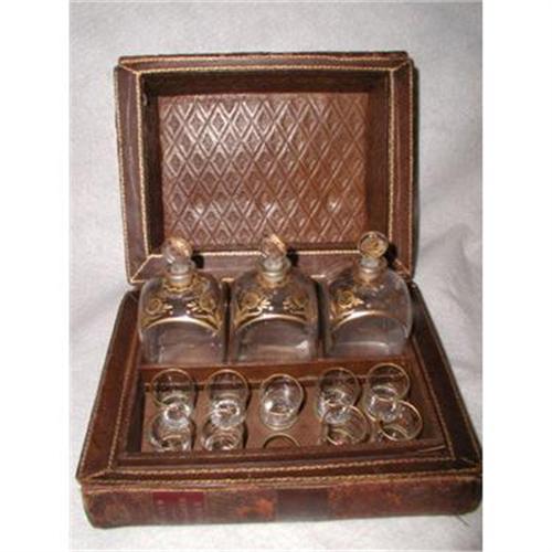 Three thick stacked books with gold tooled accents and paper pages comprise the box for this C.1850-60 tantalus from France. Dark brown leather interior with gold tooling runs along side the compartments which house three small round shoulder decanters with 24K gold floral design and ground stoppers. The nine small glasses have the same 24K gold rim. One glass missing and fit into holes outlined in brass. The interior of the lid offers the same dark brown leather with gold tooling along the edges with a diamond patterned leather lid and embossed design. All decanters and glasses in excellent condition. The box has minor loss of leather in tiny areas along the spines as seen in the photo and slight scuffing to top which adds to the aged look. The "pages" are in wonderful condition. A handsome set. Measures 10L X 8.25D X 5.5H.