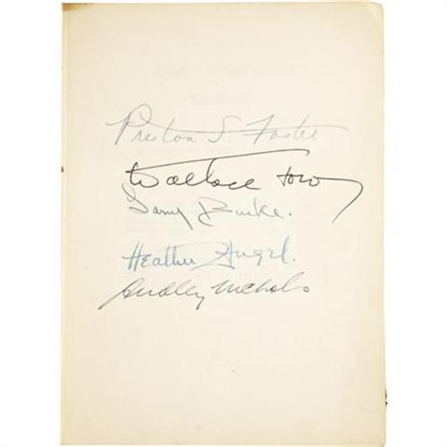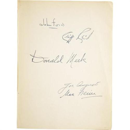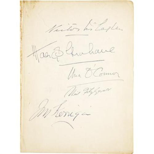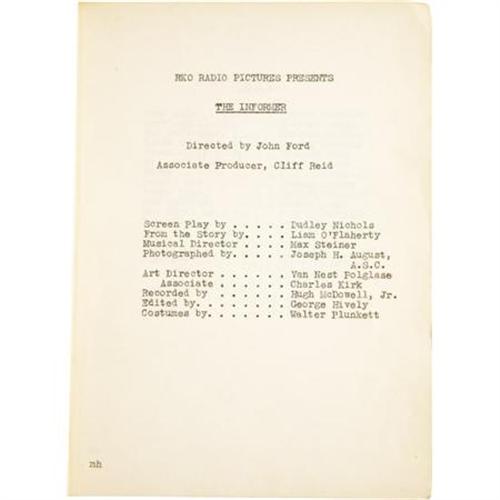<B>Leather-Bound Script for "The Informer," Signed by Victor McLaglen, John Ford, Dudley Nichols and Max Steiner.</B></I> A truly distinctive piece of Hollywood history, this is a leather-bound script for RKO's <I>The Informer</B></I> (1935), the classic saga of 1922 Ireland, based on the Liam O'Flaherty novel. The film won Oscars for Victor McLaglen (Best Actor), John Ford (Best Director), Dudley Nichols ( Best Screenplay) and Max Steiner (Best Score) -- all of whom have signed the opening leaf pages. The book also features the autographs of associate producer Cliff Reid, cinematographer Joe August, and cast members Heather Angel, Preston Foster, Margot Grahame, Wallace Ford, Una O'Connor, J.M. Kerrigan, Neil Fitzgerald, Donald Meek and Larry Burke. The script book measure 6.5" x 8.5," has <I>The Informer</B></I> and "Presented to Seymour Roman" engraved on the black leather cover in gold lettering, is 199-pages long and is quite battered; the cover damaged and its spine is missing. (The condition isn't surprising, as the original consignor found the script tossed on a roadside by a landlord!) However, the ink signatures inside are clean and the script is intact and in overall Fair to Good condition. There's interesting Academy Award history associated with <I>The Informer,</B></I> as Dudley Nichols originally refused his Oscar, boycotting the ceremony, claiming the Academy was basically a "union buster" and fighting for a Screen Writers Guild. Nichols sent his Oscar back twice, finally accepting it in 1938 only after the certification of the SWG. It's an ultra-rare occasion when a piece of vintage Hollywood history turns up with the signatures of four Oscar winners, all of whom won for the film the piece represents. The script comes with a two-page print-out from the <I>Antiques Roadshow</B></I> website, detailing the book's rescue and Nichols' Academy defiance. A wonderful vintage Hollywood artifact.<BR><BR><b>Shipping:</b> Books & Catalogs (<a target="_blank" href="http://www.heritageauctions.com/common/shipping.php">view shipping information</a>)