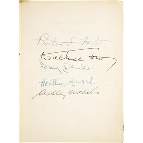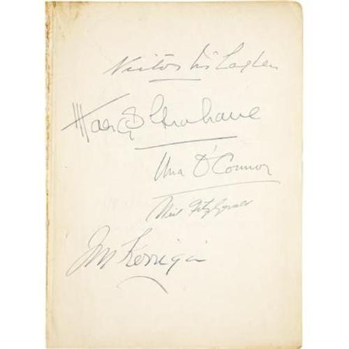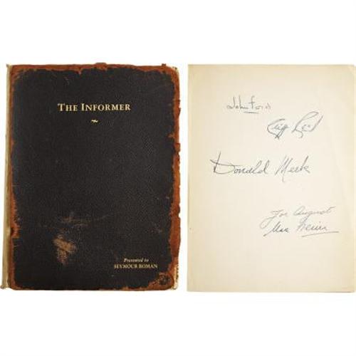 <B>Leather-Bound Script for</B></I> <B><I>The Informer,</B></I></B></I> <B>Signed by Victor McLaglen, John Ford, Dudley Nichols and Max Steiner.</B></I> A truly distinctive piece of Hollywood history, this is a leather-bound script for RKO's <I>The Informer</B></I> (1935), the classic saga of 1922 Ireland, based on the Liam O'Flaherty novel. The film won Oscars for Victor McLaglen (Best Actor), John Ford (Best Director), Dudley Nichols (Best Screenplay) and Max Steiner (Best Score) -- all of whom have signed the opening leaf pages. The book also features the autographs of associate producer Cliff Reid, cinematographer Joe August, and cast members Heather Angel, Preston Foster, Margot Grahame, Wallace Ford, Una O'Connor, J.M. Kerrigan, Neil Fitzgerald, Donald Meek, and Larry Burke. The script book measure 6.5" x 8.5", has <I>The Informer</B></I> and "Presented to Seymour Roman" engraved on the black leather cover in gold lettering, is 199-pages long and is quite battered; the cover damaged and its spine is missing. (The condition isn't surprising, as the original consignor found the script tossed on a roadside by a landlord!) However, the ink signatures inside are clean and the script is intact and in overall Fair to Good condition. There's interesting Academy Award history associated with <I>The Informer,</B></I> as Dudley Nichols originally refused his Oscar, boycotting the ceremony, claiming the Academy was basically a "union buster" and fighting for a Screen Writers Guild. Nichols sent his Oscar back twice, finally accepting it in 1938 only after the certification of the SWG. It's an ultra-rare occasion when a piece of vintage Hollywood history turns up with the signatures of four Oscar winners, all of whom won for the film the piece represents. The script comes with a two-page print-out from the <I>Antiques Roadshow</B></I> website, detailing the book's rescue and Nichols' Academy defiance. A wonderful vintage Hollywood artifact. This signed movie script was featured as a filmed segment on the <I>Antiques Roadshow</B></I> in 2006.<BR><BR><b>Shipping:</b> Books & Catalogs (<a target="_blank" href="http://www.heritageauctions.com/common/shipping.php">view shipping information</a>)