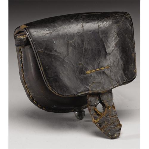 <B>Leather Cap Pouch.</B></I> An unmarked, generic leather cap pouch, 3.75” x 3.5”, complete with belt loop and flap retaining strap and metal stud, with crazing to the surface, else good condition. <BR><BR><b>Shipping:</b> Miscellaneous Collectibles, Smal (<a target="_blank" href="http://www.heritageauctions.com/common/shipping.php">view shipping information</a>) <BR><BR><B>Import