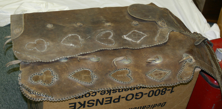 Leather Chaps Pair of leather chaps. Overall measurements at largest points approx. 35” x 25.” Metal fasteners for legs still present. The flat half of belt at waist has been replaced and attached with bolt. One grommet at front waist is missing. Well-worn, decorated with various cattle brand emblems.
