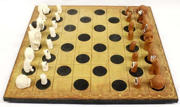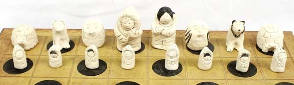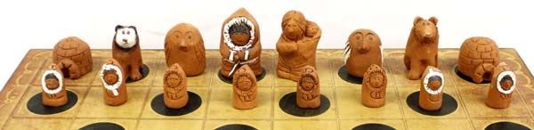 Beautiful Noah's Art Leather Covered Chess Board w/ Canadian Inuit Clay Pieces, the chess board measures 19.5'' square and has a hand tooled border, the largest chess piece measures 2.75'' x 1.5'' and they include Canadian Inuit people, sled dogs, owls, and igloos, Sweet!!!!