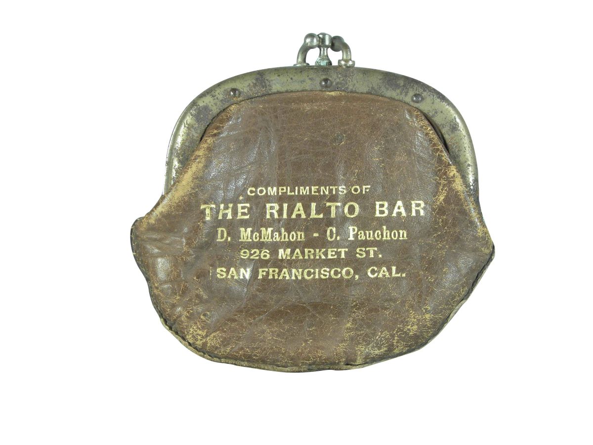 Leather Coin Purse, compliments of "The Rialto Bar", San Francisco. Some rust on closure and slight wear to leather otherwise good condition. 3 1/4 X 3 inches.
