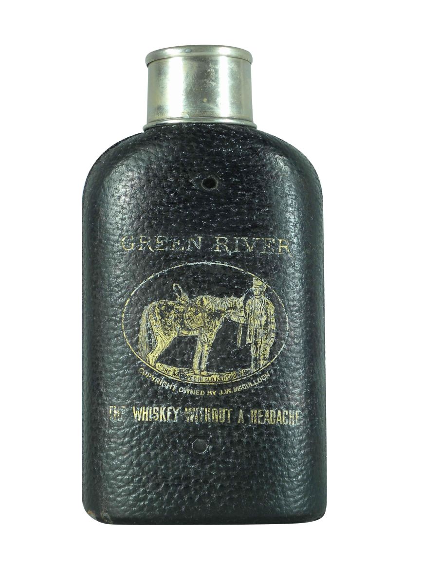 Leather Covered Glass Whiskey Flask, with shot glass lid. Advertising Green River Whiskey. Good original condition. Two pint size.