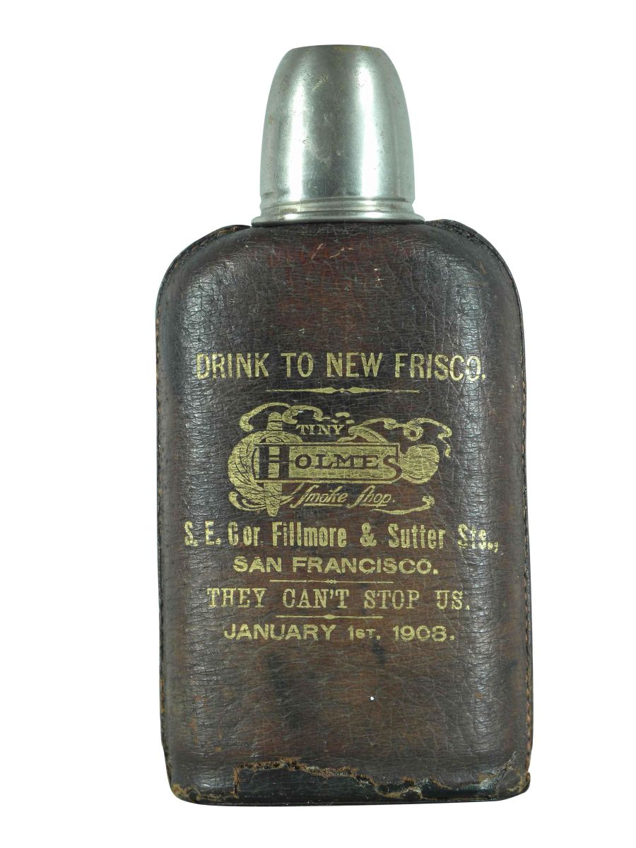 Leather Covered Glass Whiskey Flask, with shot glass lid. "Tiny Holmes Smoke Shop". S.E. Cor Filmore & Sutter Sts. San Francisco. Very good condition. Pint size.