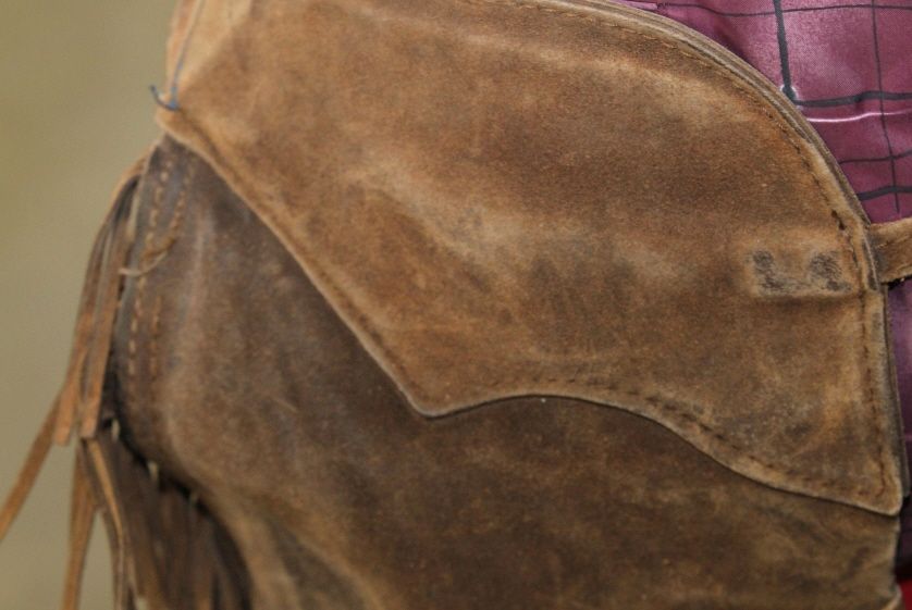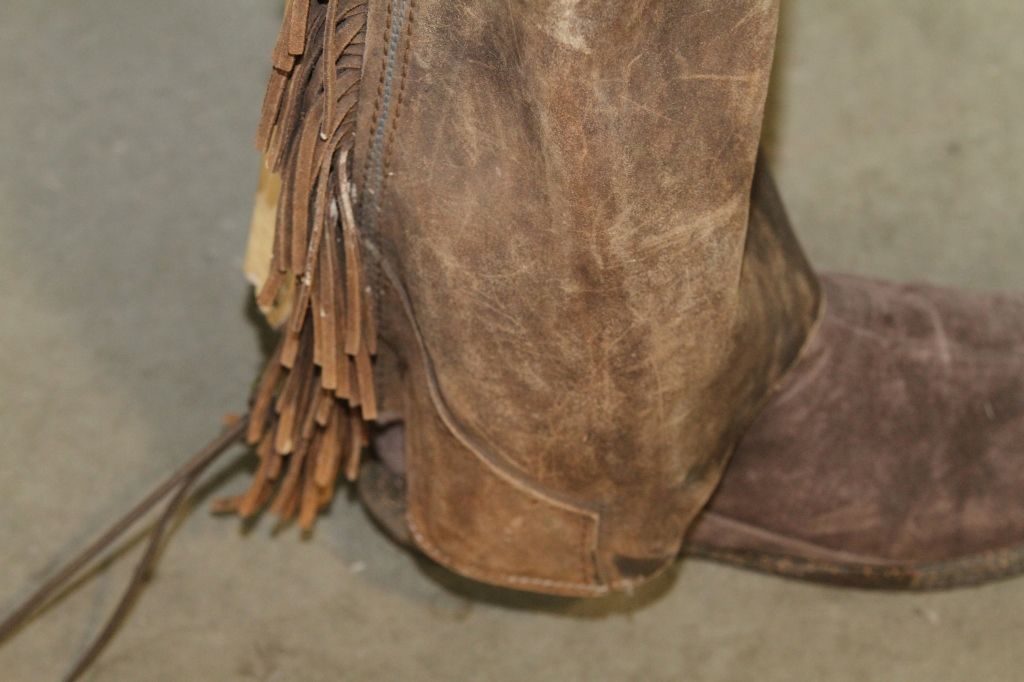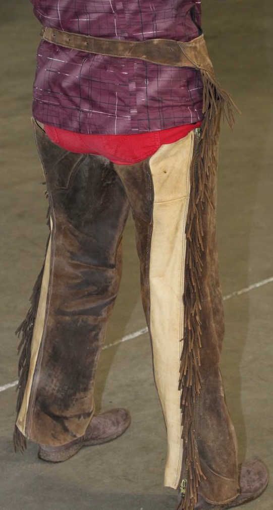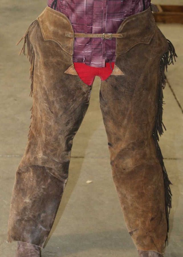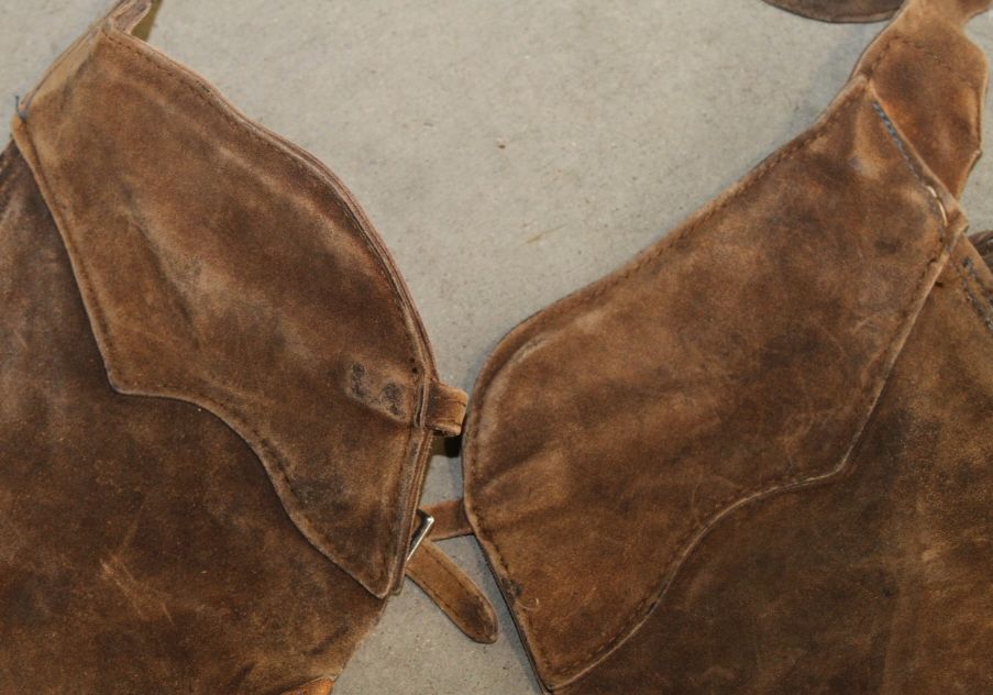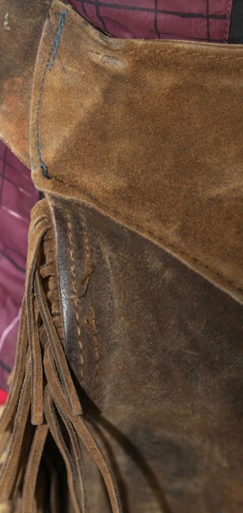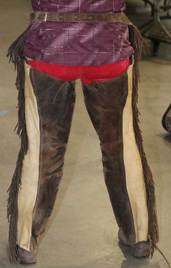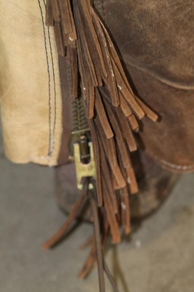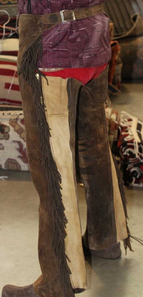 Leather Cowboy Chaps These Cowboy Chaps have fringe along the entire sides and are made with heavy duty zippers. Would fit any western decor or could be used.