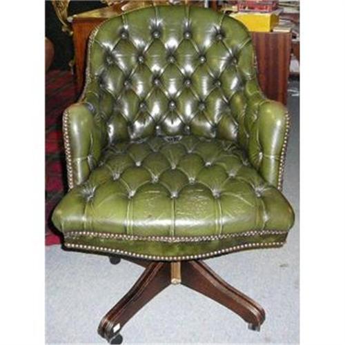 This is a wonderful leather desk chair with a tufted back, tufted seat and trimmed with nailheads.