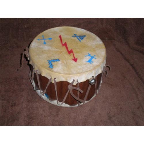 Leather Drum W/Indian Items on It. This is a cute leather drum, and has leather top showing a Teepee, Cross Arrows, and a deer, and lightning Bolts on one side and on the other it has an eagle with Lightning bolts and is tied together with rawhide. It does show that is was used and still looks and sounds great. It is 5.5" H X 8.5" Diam. Great add to any collection you may have. Hope you like it.
