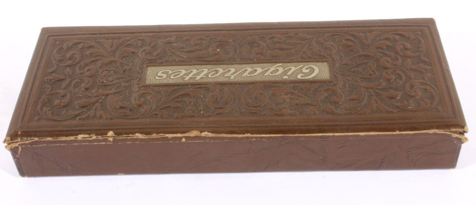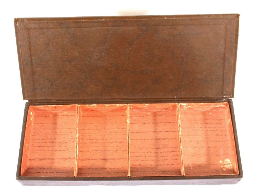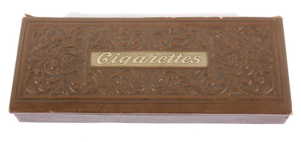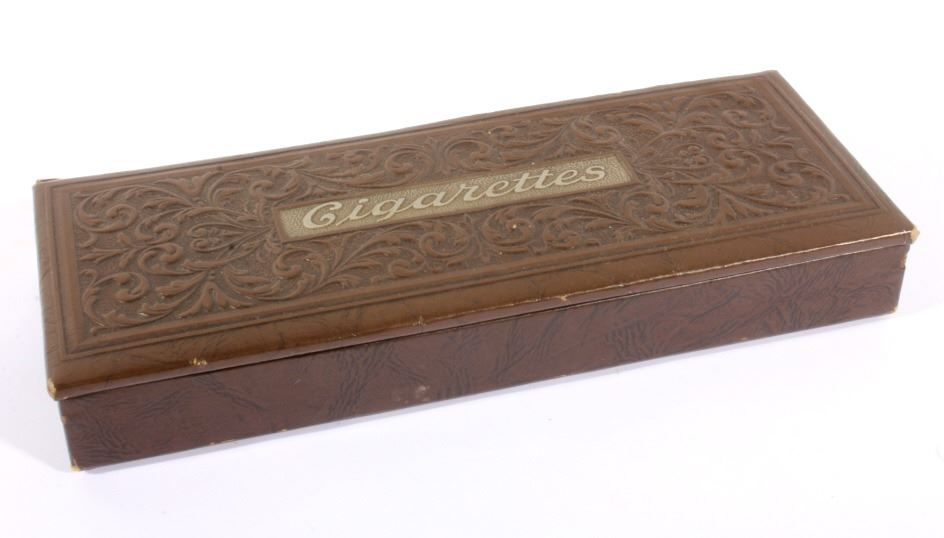 For your consideration is a leather embossed cigarette case. The case is wrapped in a rich brown leather. The top is intricately carved with a floral pattern and Cigarettes carved and dyed in the center. Interior of the case is divided into four compartments. Case is in fair condition overall. Leather is in great shape with some damage around the corners and binding. Measures 10.75" x 4.125" x 1.5".