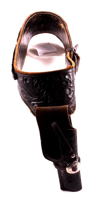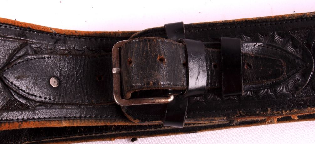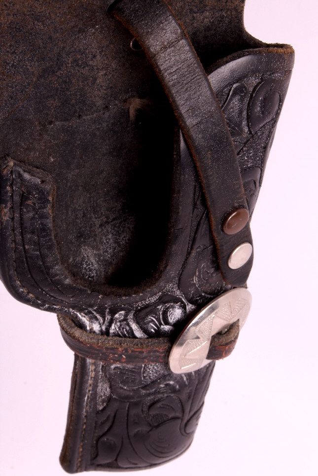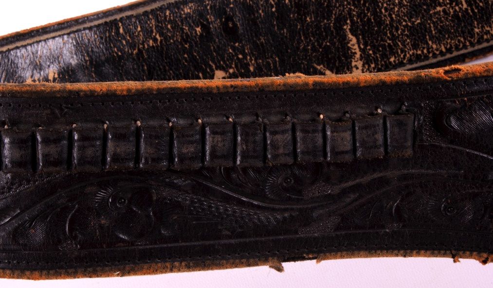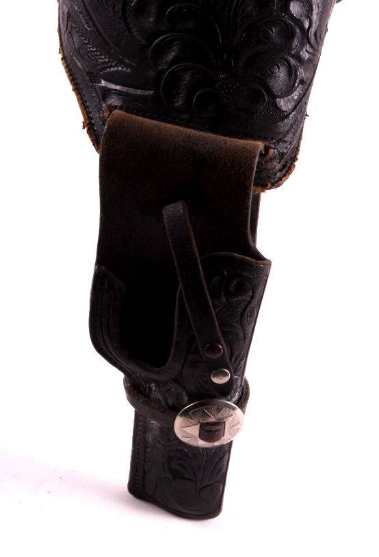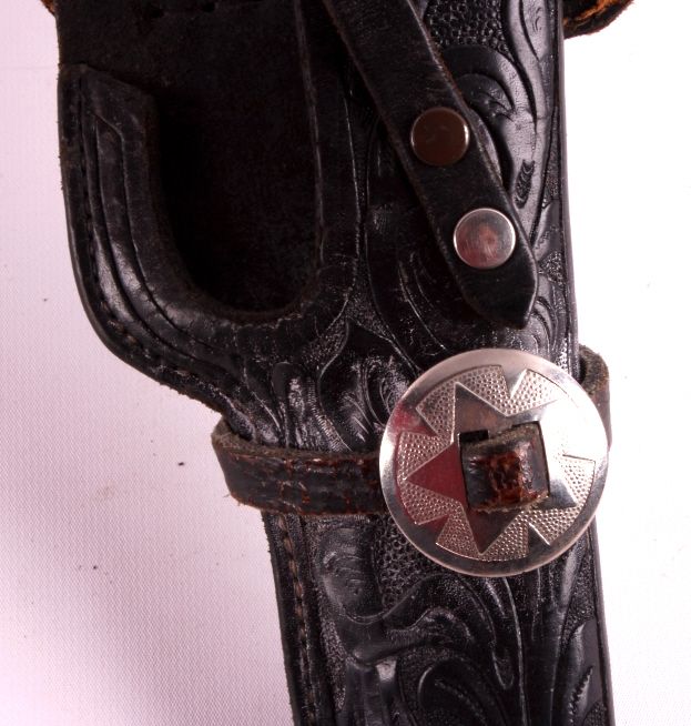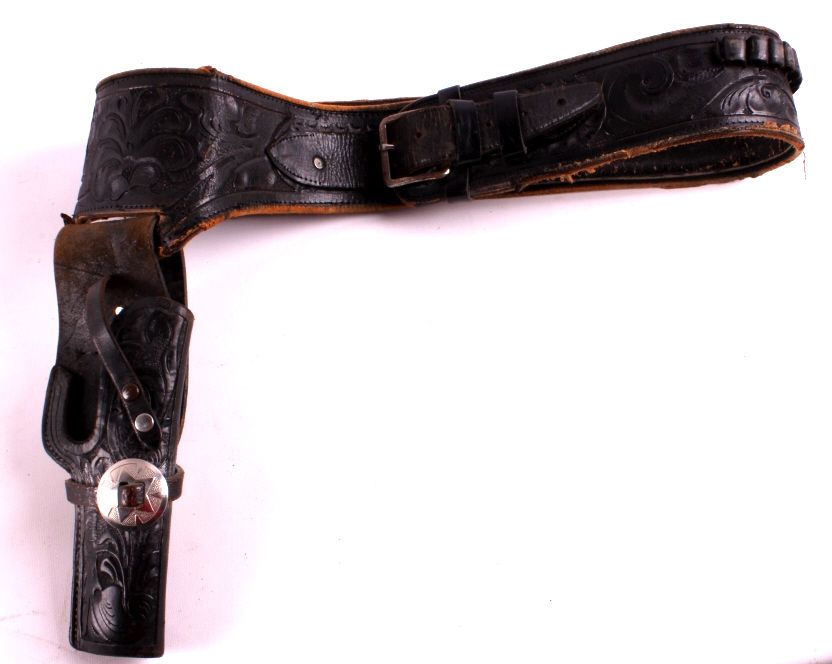This is a leather gunfighter belt and holster. The belt and holster feature a hand tooled western design. The holster is adorned with a silver concho. The backside of the belt holds 43 rounds of ammunition. The belt and holster are in good condition.
