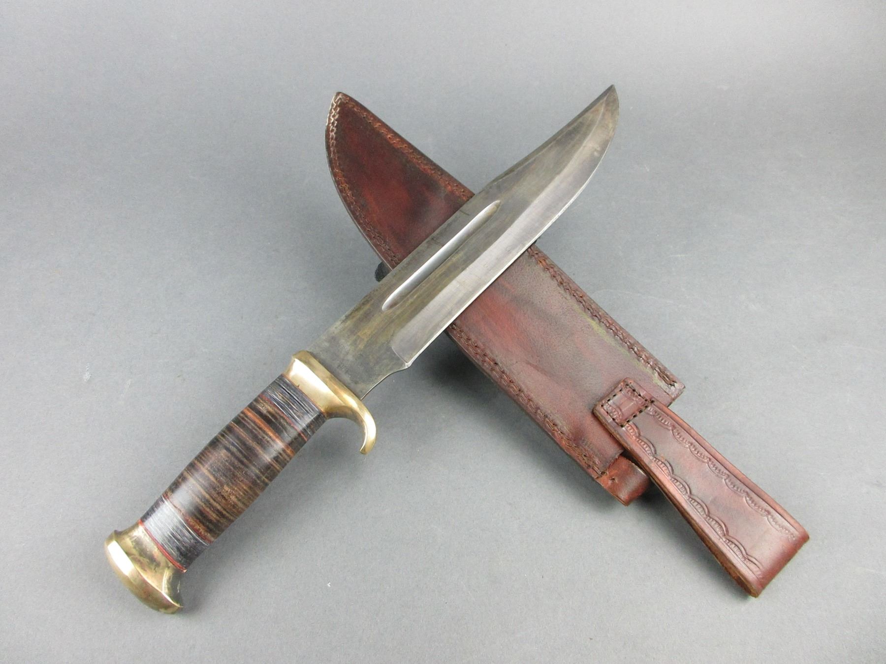 Leather Handled Clip Point Bowie Knife- 11" Blade- 5.75" Handle- Stamped Sheath