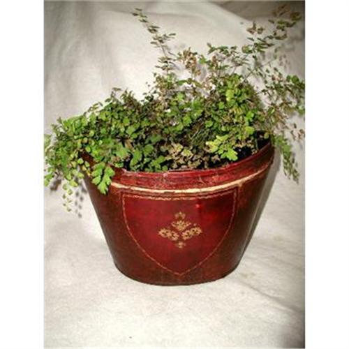 Red mahogany gentleman's leather top hat box from England C.1850-65. Wonderful deep red/brown leather shield design on the front with crown and decorative gold tooling. As it no loner has it's lid,makes an excellent planter,magazine rack,wastebasket,file box or a ton of other decorative uses. Missing a few tiny bits of leather and scuffed a bit as seen adding to it's character. Measures 13L X 11.5D X 9H.