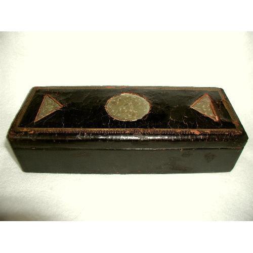 Unusual early 19th century black leather box with gold tooling surrounding the lid as well as two triangular and one round piece of open work jade inlaid into the top. The wood interior houses 4 compartments with brass name plates above each. Solid brass hinge. Probably used by a distinguished men's clothier of the early 1800's for display and choice of a stud,cuff-link or tie tack collection as the paper stamp on bottom refers to the box as the "Preference Chest". Bottom is lined with black felt. Wonderful box for use as a man's valet or desk accessory despite the tiny spots of worn leather. Measures 10L X 4D X 2.75H.