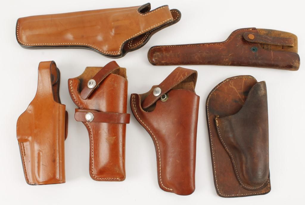 Includes a Woodsman holster, a pocket holster for a 1903 or 1908, a Buchmeir S&W K frame, a Bianchi Beretta 92, a Buchmeir J frame, a S&W N frame Bianchi.