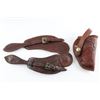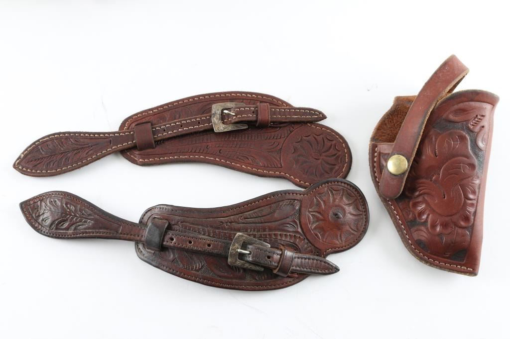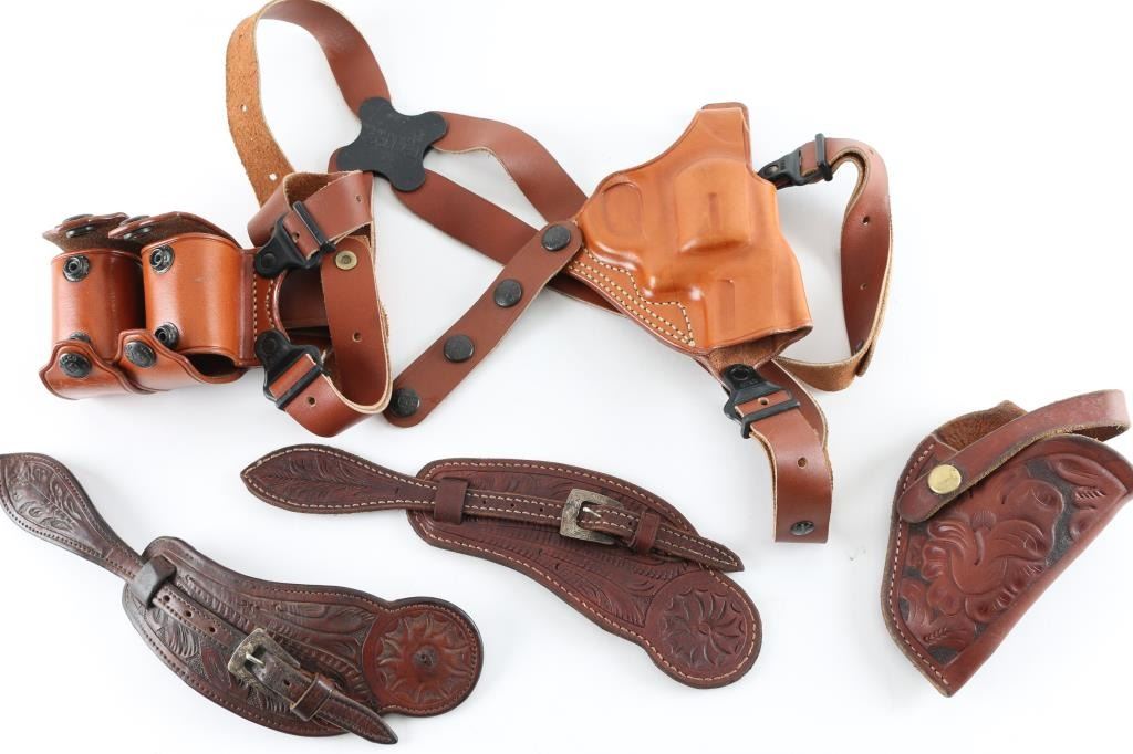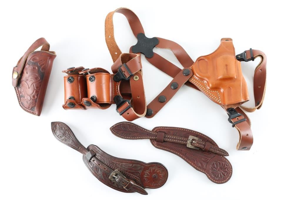 (1) Tooled Leather Spur Straps leather by William Brown and one buckle is Bohlin one is copied by consignor. (1) Galco Leather shoulder Holster (1) Leath Kemner Maker small tooled revolver holster