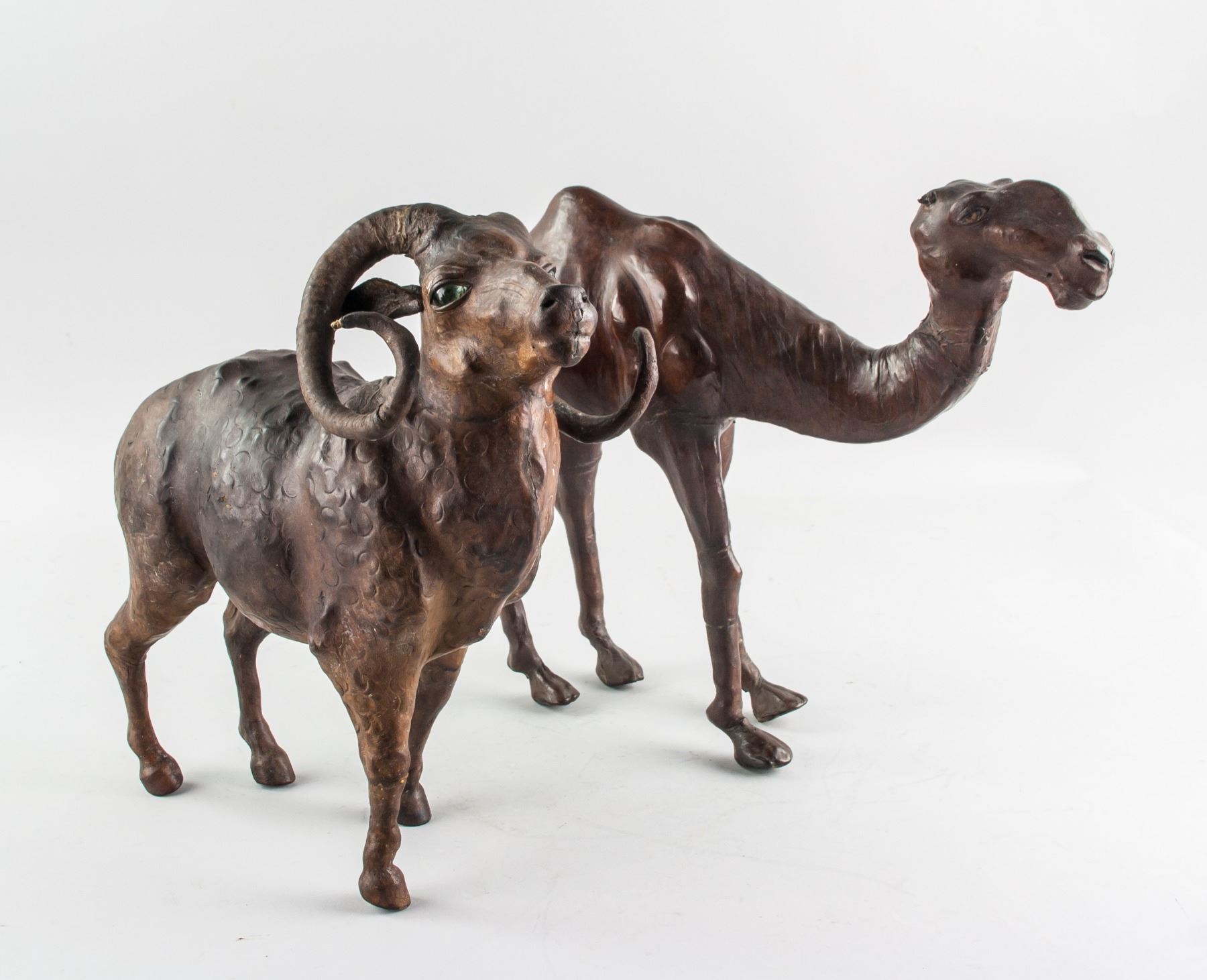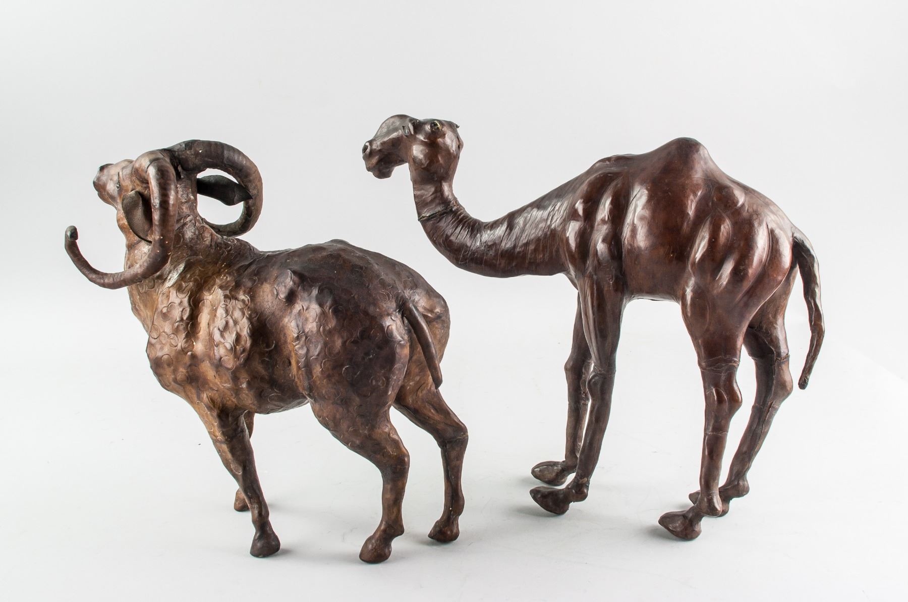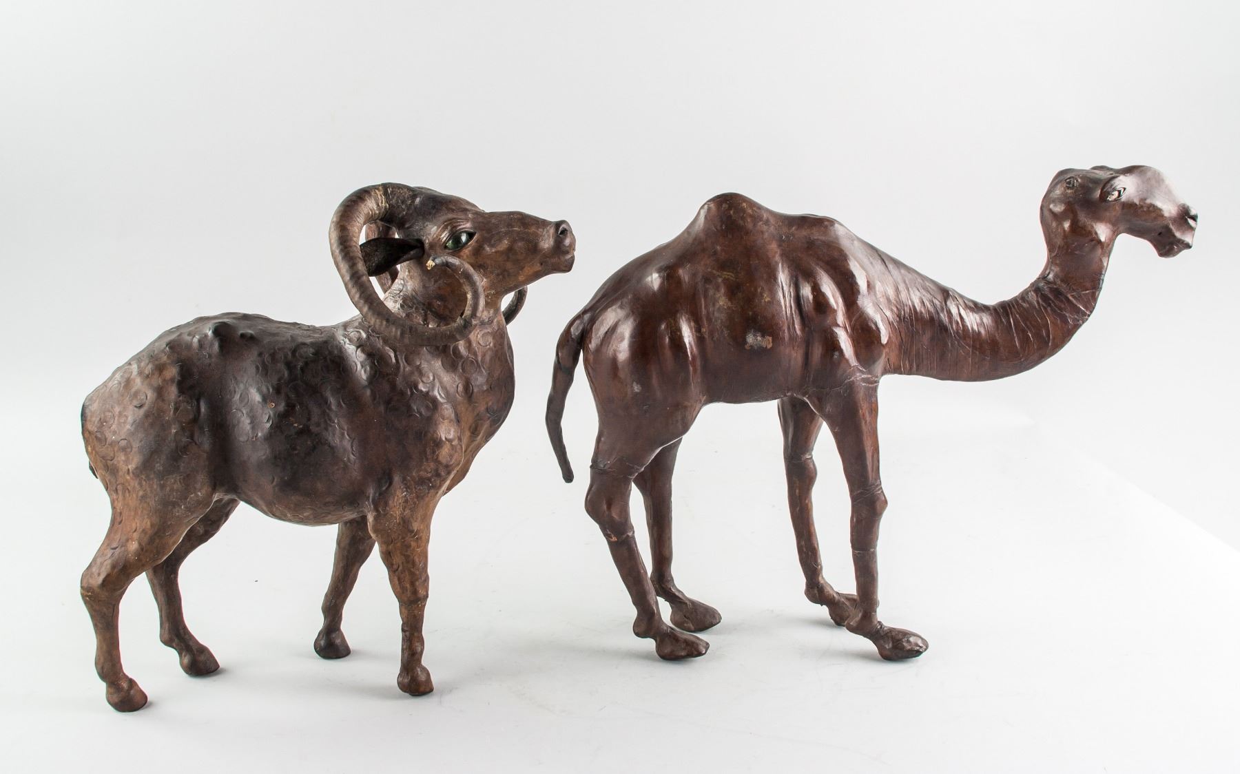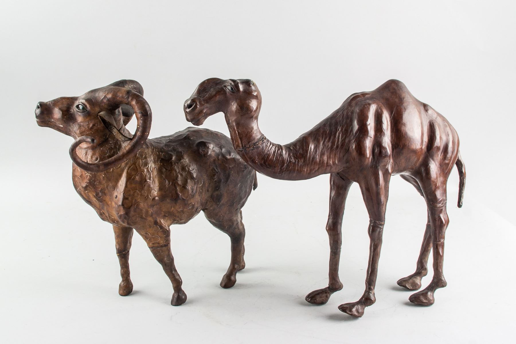 2 assorted leather animal figures, of 1 camel and 1 ram, ears of camel are missing, made of unknown leather, 28 x 36 cm, 1230 grams